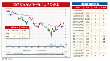 慧洋-KY受惠運回升國內的散裝船運公司慧洋-KY(2637),主要以中小型船舶為主,目前共有一二四艘船舶,是國內擁有船舶數最多的散裝航商,目前船舶有三艘Capesize、二三艘Panamax、十八艘Supermax、三七艘Handysize、三八艘smallhandy、五艘其他,經營模式以合約船為主,合約比例約佔九○%,其餘一○%則為現貨船舶經營。目前大型Capesize現貨運價已來到二五○○○美元/日,優於一般航商成本的一五○○○美元/日,且現貨船毛利率已達三○%以上;Panamax型船舶現貨運價目前約一二○○○~一三○○○美元/日,也優於一般航商成本的九千~一萬美元/日,有利於散裝航商營運及未來換約,而慧洋-KY二○一八年將有三十艘以上船舶進行換約,將可大大受惠現貨運價回升的狀況。慧洋-KY今年新造船舶下水達十一艘,在新式船舶具有節能環保優勢下,新船毛利率均在二五%以上,明年預估將有七艘新式船舶將下水加入營運,依目前現貨運價預估,二○一八年新船毛利率將在三○%以上,成長可期。