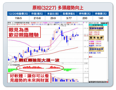 (1)任天堂Switch加持,獲利轉機大成長:受惠任天堂Switch全球熱銷,以及電競滑鼠和安全防護等二大產品線銷售暢旺加持,加上近年來整合自有專利及演算法的感測元件委託設計(NRE)營收入帳,帶動第三季合併營收達十三.九億元,季增七.三%,年增二五.三%,歸屬母公司稅後淨利達二.三三億元,季增二七.五%,年增逾七倍之多,EPS達一.八三元,創七年新高。公司自結十月獲利達○.六七億元,較去年同期大增超過二.八倍,優於預期,EPS○.五六元,累計前十月EPS達四.五二元,已大大超越去年全年一.二元獲利水準,預估今年EPS上看逾五.二元,明年獲利展望更佳。(2)Switch揮軍大陸,原相盼吃大補丸:任天堂Switch聖誕、跨年旺季持續延燒,缺貨潮恐延續至明年,也傳出Switch將在明年揮軍大陸市場,可望又將帶動一波強大買氣,感測元件供應商原相也將迎來追單熱潮,加上電競滑鼠熱賣,原相今年起不需要支付Avago權利金,也可望帶動原相業績「跳躍式」增長。外資也看好Switch累計銷量在二○二三年三月有機會上看一.一五八億台,挑戰任天堂史上最賣遊戲機。(3)健康量測夯,原相瞄準手機市場:有消息指蘋果或三星新一代旗艦機系列有意順應全球運動潮流,導入健康量測功能,將成為後續智慧機一大賣點,也可能會有其他品牌陸續導入,可望帶動原相在健康量測感應器相關訂單大進補。原相在車用手勢sensor與模組廠持續合作開發,進度符合預期,明年上半年有機會量產(※基本面資料若有異動,依公開資訊觀測站最新訊息為主)。【操作建議】低接不追高,下檔守穩前低一四二元關卡不破,逢低於富貴線附近仍可留意,趨勢走多向上,一旦控盤指標及攻擊力道可雙雙翻紅轉強,隨時可望再啟一波漲升行情,設好停損停利(詳見附圖說明)。