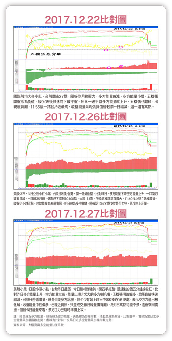 二十六日大跌百點,我在FB說:守一○四○○點支撐的機會不小,但還需訊號確認。收盤後,看了一下各媒體,一堆人都認為二十七日會直接破一○四○○點,下探一○三二二點。前一晚美國蘋果股價大跌,台股ADR也全面跌一~二%以上,早上電視分析師更大多看二十七日下破一○四○○點,結果只有開低二點,開盤後就向上急拉,不但是四手紅盤,還是連拉八個五分鐘線收紅,跌破一堆人眼鏡。其實回頭一看,從十二月十一日至二十七日,共十三個交易日,最高點一○五七七點,最低點一○四○八點,不就還在我們之前說的一○四○○至一○六○○點之間震盪嗎?只是控盤者故意弄得讓大家摸不著頭緒。尤其二十六日,配合一堆利空重挫百點,嚇得市場紛紛看空。然而,我的看法不變,最多再震盪幾天之後,也就是最慢在元旦之後,就會向上拉抬突破一○六○○點,仍有向上挑戰一○七○○至一○八○○點的機會。我知道目前媒體利空一堆,台股四大天王弱勢,自一○三二二點之後的B波反彈,既無量又無力,週線應該要進行C波下跌……所有空方的理由我都知道,但能量與時間波浪告訴我,就是會向上。對與不對,就讓時間來驗證了,謹供參考。