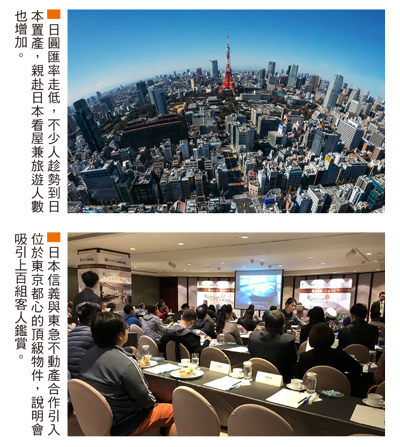 日本一直是國人海外置產的熱區,而國內房仲業者帶客人到日本買房的品牌首選「日本信義」,成立已八年,累積成交超過二千四百件,今(二○一七)年更帶看一千三百多組客戶,而為了提供更好的服務,日本信義除明年將在東京成立第一家門市外,更與東急不動產合作,共同推介都心精華地段的億元宅。日本信義社長何偉宏指出,日本經濟發展仍在加速中,而其中「經濟成長率(GDP)」、「央行低利率」及「日圓匯率」等關鍵三率是很透明的判斷指標,加上日本政府對房市政策持續維持正向態度,都成為海內外投資人看好日本巿場的因素。與東急不動產合作 推出都心精華地段億元宅他說,日圓匯率走低,不少人趁勢到日本置產,近期日本物件詢問度增加近二倍,親赴日本看屋兼旅遊人數也增加。何偉宏表示,日本信義成立八年以來,累積成交超過二千四百件,總銷金額達一千五百五十億日圓(約新台幣四一五.四億元),已是國人赴日置產的首選品牌;今年截至十一月底為止,已服務一千三百多組客戶赴日看屋,平均每天帶看超過四組,較去年成長一○%。此次與東急不動產合作引入位於東京都心的話題熱區-港區及千代田區頂級物件,十二月初於台北舉辦首賣鑑賞會,吸引上百組客戶參加,且已有多組客戶提出購屋申請。東急不動產住宅事業群首都圈住宅事業本部本部長大谷宗德表示,東急不動產自二○一○年開始與日本信義合作,現在合作範圍已擴展到大阪。這次為大家介紹的三個物件都屬於東急不動產旗下的頂級住宅品牌「BRANZ」系列,地理位置極佳、稀有性高,相對的資產價值性也高,相當值得推薦。他說,東急不動產未來也會持續為台灣客戶介紹更多優質的物件,希望台灣客戶能親自前來日本體驗物件的品質與優質的服務。何偉宏說,隨著國人赴日置產持續走強,回購者多、商用物件成未來趨勢的情形之下,除東京營運已有一定規模之外,大阪支店亦已進入穩定發展階段,關西地區含大阪、京都之成交件數亦已佔整體近一五%。大阪支店增員擴編 東京店面門巿瞄準在地客群此外,日本信義在東京的第一家門市預計將於二○一八年下半年成立,初期將以門店周邊區域的委售服務為主力,融合台式熱情與日式精緻服務的獨家經營模式,相信將能為有服務大國美譽之稱的日本注入新氣象。