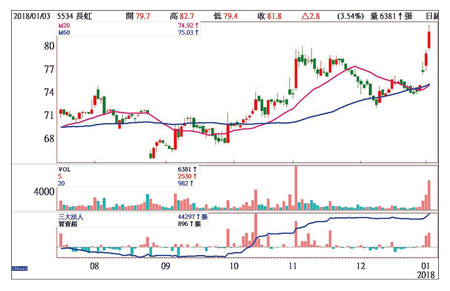 營建資產股價值低估其中幾檔營建資產股可多加留意,長虹(5534)目前本益比約七倍,二○一七年前三季EPS六.二元,第四季還有「長虹天璽」交屋入帳,二○一七年EPS有挑戰九元的潛力。而出售給中華郵政的大樓,金額約六四.二億元,依淨利率三○%計算,淨利約十八至十九億元,光這一筆帳獲利貢獻預估就超過前三季EPS的六.二元,市場估約六.六元,預估今年第一季入帳,也就是說二○一八年EPS是從六元起跳。另外,在手建案可有效支撐未來三年營收。技術面上週五(二○一七年十二月二十九日)跳空後見上影線,一月二日、三日連走長紅突破創高,多方已表態,上週五多方缺口不補皆視為多方勢。中工(2515)除了正在銷售的民生社區「中工耘翠」之外,今年有個超級大案即將推出─「陶朱隱園」,曾獲選CNN二○一六年全球九大城市地標建案,可說是題材性十足。力麒(5512)二○一七年前三季EPS○.九四元,目前股價不到十元,本益比不到十倍之外,第四季雖僅剩餘屋銷售,但全年EPS一元的達成應不是難事。除了本業之外,透過轉投資山林水(8473)進入大陸環保事業則將受惠於政策題材,由於大陸環境保護稅法於一月一日開始實施,因此才有先前崑山勒令停工的消息,而力麒轉投資的山林水正是主攻環保工程,轉投資大陸安寧北控浩源四○%股權,主要經營安寧市污水處理業,而北控水務目前是大陸水工程龍頭廠,環境保護稅法的實施對於山林水的轉投資事業是好事,對於母公司力麒也是正面。正所謂十年河東十年河西,隨著市場資金注意到一些被低估的傳產股時,不論是對於指數的穩盤效應,或是對於一些善於作好資產配置的投資人來說,不失為一個好機會。