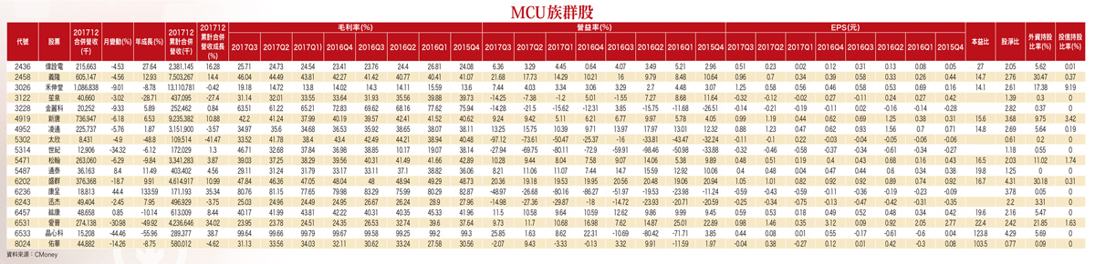 儘管市場即將進入第一季半導體傳統淡季,惟供給能量目前仍遠低於需求,顯示市場對MCU需求量仍大,對MCU相關上下游供應鏈台廠偉詮電(2436)、笙泉(3122)、金麗科(3228)、新唐(4919)、凌通(4952)、太欣(5302)、松翰(5471)、通泰(5487)、盛群(6202)、迅杰(6243)、紘康(6457)、佑華(8024)、愛普(6531)、晶心科(6533)、M31(6643)等個股而言,為一重要基本面利多。盛群表示,因公司與台積電、聯電等晶圓代工大廠,向來具備緊密合作關係,現階段交貨一切正常。新唐則因擁有自家專屬晶圓廠,MCU產能供給順暢無虞。NXP、ST全球MCU大廠調漲報價,對台灣MCU大廠盛群、新唐等無疑為一重要利多消息,預料將有助其後市營收、獲利成長動能。根據IEK預估,二○一五年至二○二○年,全球MCU市場規模複合平均年成長率約二.九%,將呈穩定成長態勢;且為因應SoC高度整合製造趨勢,以及IoT內建應用需求下,二○一五年起ASP已止跌回升。台灣於全球MCU市占率不到五%,預估相關MCU廠未來營運成長性將高於歐、美、日等同業大廠。MCU朝高階、高位元發展 相關台廠爭搶商機隨著高位元MCU逐漸縮小與市場低位元MCU之間價差,出貨量已開始見明顯提升,目前,三十二位元MCU已廣泛應用於消費電子與通訊產品、工業、物聯網、健康照護等領域,躍升MCU市場應用主流。新唐(4919):為台灣最早投入三十二位元微控制器(MCU)研發、產銷專業IC晶片廠,自二○一○年推出首款三十二位元MCU產品後,盛群、松翰、九齊亦相繼跟進投入三十二位元MCU研製。隨著MCU晶片設計,朝向高階、高位元發展趨勢確立下,繼新唐搶進三十二位元MCU市場後,佑華、紘康也先後跟進推出三十二位元MCU,以三十二位元MCU為營運重點,台灣MCU晶片廠幾乎可說是已全面進軍三十二位元MCU市場。佑華目前旗下AM32A100系列三十二位元高效能MCU產品已正式量產,亦持續進行AM32B200系列三十二位元低功耗、高效能MCU產品開發作業,將鎖定高階教育、自動化控制等工規產品應用市場。紘康預期,受惠三十二位元MCU產品應用成長熱潮帶動,可向既有客戶導入高階產品線,亦可進一步擴展華南區以外市場客戶,切入中高階居家、醫療電子裝置領域。市場追逐MCU漲價題材 MCU上游業者三強衝鋒市場於追逐台股盤面後市可能受惠,加熱、大幅升溫之MCU漲價熱潮受惠股的同時,其實往往容易因為大多聚焦於MCU晶片生產廠相關標的股,而忽略了MCU晶片IC廠上游原材料(物料、生產要素)如:IP矽智財、記憶體、先進晶圓(片)製程IP供應廠商。愛普(6531):PSRAM製造廠。PSRAM─Pseudo SRAM,類靜態隨機存取記憶體:具備SRAM簡易好用特點,無須像DRAM般需不斷充電(refresh)以保存資料,亦可於晶圓單位面積─die(晶粒)上製造更多記憶體晶片,價格較SRAM便宜許多。M31(6643):電子訊號通連電路「USB 2.0/3.0實體層IP、BCK USB實體層IP」IP廠(二○一二年底已成為台積電矽智財聯盟成員)。晶心科(6533):「無線通訊、物聯網應用晶片組製程(22FDX(FD-SOI)-rfa製程、22FDX(FD-SOI)-mmWave製程)」解決方案IP廠。