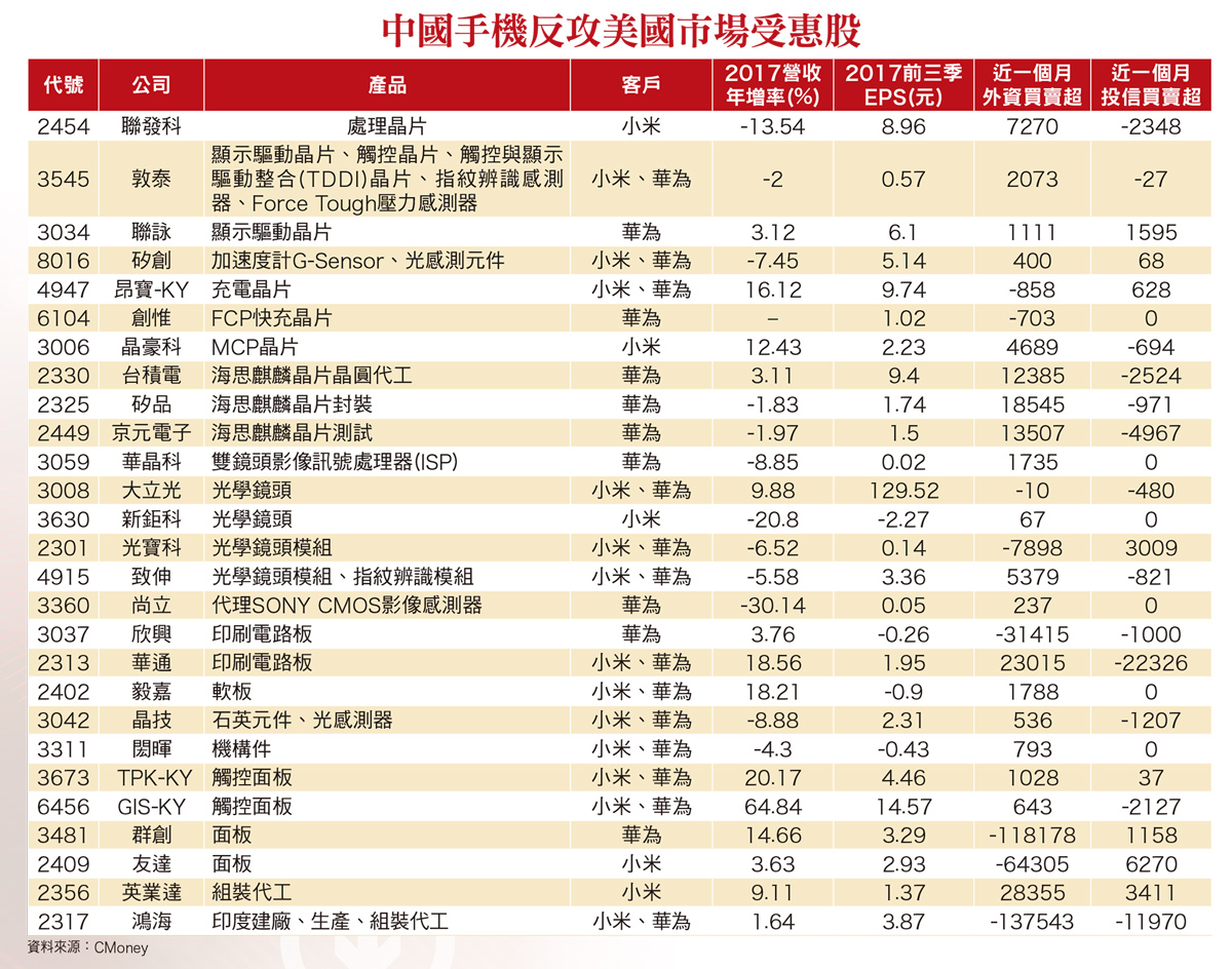 隨著中國智慧型手機市場趨向飽和,為了尋找新的成長動能,各品牌場無不積極揮軍海外市場。繼中國紅軍在印度市場取得勝利後,預期下一站將是直搗iPhone大本營的美國市場。二○一七年十二月彭博社(Bloomberg)報導,中國兩大品牌廠華為及小米,正與美國電信商AT&T及Verizon就當地銷售旗艦智慧型手機進行商討。預估在開拓新市場的助威下,今年銷售量成長率有望超越產業平均值,連帶相關供應鏈營運表現也將優於同業。高通專利保護傘 中國品牌走向海外有別於中國市場的銷售模式,美國市場基本上都是被電信商所壟斷,多數美國消費者購買手機都通過AT&T、Verizon、Sprint及T-Mobile等美國四大電信商,電信商通路銷售占美國總出貨量達八○%以上。因此,中國品牌廠想成功搶食美國市場大餅,就必須先獲得電信商的支撐。中國手機品牌走向海外市場,首先要面對的風險就是專利訴訟戰。台灣品牌HTC進軍美國市場就在專利上栽了跟頭。二○一一年美國國際貿易委員裁定HTC侵犯蘋果一項專利,從隔年四月十九日起禁止進口侵犯該專利的手機至美國,正是宏達電(2498)的營運自高峰反轉的關鍵因素。之所以如此,在於手機各項底層技術幾其起源自美國,包括應用處理器專利、攝像頭模組專利及Baseband基頻部分專利等,美國又有許多專利流氓專靠專利訴訟索賠及授權來獲取暴利。中國手機品牌商在美國、歐洲及東南亞等地也都遭遇過專利訴訟,目前又以印度市場為最多。二○一四年愛立信(Ericsson)及印度智慧手機廠Micromax分別指控小米及一加(OnePlus)侵權,二○一六年杜比實驗室(Dolby)指控OPPO及vivo侵權,四個品牌均被印度法院頒布禁售令。其中,小米最終得以解套的原因,除了每台手機預繳一百盧比向印度法院提存外,也是高通專利傘適時發揮的作用。小米手機雖未獲得愛立信的專利授權,但因高通曾與愛立信交叉授權,等於小米透過高通間接獲得愛立信的授權,讓印度法院放行部分小米手機銷售。目前高通已與超過一二○家中國手機廠簽署了專利許可協議,成為中國品牌能在全球市占率前十名取得七席的重要功臣。擁有自身專利 反守為攻是關鍵華為則是少數反過來控告國際大廠的中國廠商,二○一六年五月先是在中國及美國指控三星的手機,未經授權使用華為4G LTE、操作系統及用戶接口軟體等專利技術。同年七月又在美國指控T-Mobile侵犯擁有的十四項4G LTE專利技術。華為的反擊動作,也讓中國廠商意識到,擁有自身專利保護傘才是走出中國反守為攻的最佳策略。例如小米就在二○一六年六月宣布向微軟購買語音通訊、多媒體與雲端運算等約一五○○項專利。二○一七年七月又與諾基亞(Nokia)簽署一份多年期的商業及專利合作協議,不僅將在移動網路的標準必要專利(cellular standard essential patents)交叉授權,還包括小米收購部分諾基亞專利資產。同年十二月華為也與諾基亞簽訂了一項為期多年的智慧型手機專利授權協議。根據統計,諾基亞手中的通信專利中,約有三三%為GSM標準必要專利、二五%為WCDMA標準必要專利、一九%為4G LTE標準必要專利,專利覆蓋2G、3G及4G領域。預期取得諾基亞專利授權後,將可進一步降低小米及華為前進美國的風險。拉攏在地電信商 取得美國市場門票由於上述提到美國消費者偏好向電信商購買手機的習慣,能夠獲得越多家電信商支持,華為及小米在美國市場的成功機率就會越高。尤其,兩者為了打響知名度,接下來勢必會選擇旗下高規的旗艦機種來做為開路先鋒。偏偏兩者目前多是透過電商在美國銷售中低階入門機種,缺乏知名度又無法提供消費者實際體驗,要美國消費者買單價格較高的旗艦機,難度頗高。另在二月底所舉行的MWC展,預期華為將發表內建三鏡頭主相機並支援AR功能的P20系列(P20、P20 Plus及P20 Pro)旗艦機,應有機會成為進攻美國市場的第二波主打機種。華為供應鏈加速成長 小米將在香港或紐約IPO就智慧型手機銷售數字觀察,華為(包含榮耀)二○一六年銷售一.三九億支,二○一七年銷售一.五二億支,已擠進全球市占前三名。二○一八年公司銷售目標更上看二億支,逾三○%的年增率,不僅遠高於研究機構TrendForce預估全市場生產成長率的五%,也高於龍頭三星預估年增率的三%以下及第二名iPhone預估年增率的七.五%。預期偏好投資手機零組件族群的資金,將會從成長動能較低的三星及iPhone供應鏈,逐步轉向華為供應鏈。小米靠著在海外(新興市場)攻城掠地,銷售量已起死回生,也是二○一八年少數有機會再成長的手機品牌之一。小米二○一六年手機銷售四一五○支,二○一七年預估銷售九五○○萬支,整整翻了一倍多,成長率相當驚人。二○一八年藉由新增銷售美國市場,市場預估銷售量將增至一.二億支,全球市占率也有機會幹掉OPPO,上升第四名的位置。小米二○一八年的另一個亮點題材,則是下半年有望在香港或紐約IPO,傳聞雷軍的估值目標是兩千億美元,相當於一個台積電(2330)的市值。若真的順利上市,供應鏈勢必會獲得市場重新評價(re-rating)的機會。