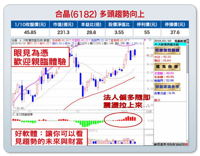 台股逐步逼近一萬一千點關卡,雖然在近關情怯,以及股王大立光(3008),蘋概股鴻海(2317)、GIS-KY業成(6456)、美律(2439)、華通(2313),光學股玉晶光(3406)、亞光(3019)、揚明光(3504),DRAM族群旺宏(2337)、華邦電(2344)、南亞科(2408),3D感測穩懋(3105)、精材(3374)、致茂(2360)及致伸(4915)…等表現不甚理想壓抑下,短線適時震盪拉回洗盤是可預期中事。不過,隨著新台幣升值,熱錢不斷,資金持續轉進到水泥股台泥(1101)、亞泥(1102),食品股味全(1201)、聯華(1229),塑化股台塑(1301)、南亞(1303)、台化(1326),紡織股力麗(1444)、南緯(1467),鋼鐵股第一銅(2009)、大成鋼(2027)、佳大(2033),金融股富邦金(2881)、開發金(2883)、中信金(2891)等作價拉抬,配合軋空股世紀鋼(9958)及日馳(1526)等大漲支撐,現階段行情可說是進入百年難得一見的盛況,故對於短期指數震盪拉回洗盤整理,不足為慮,重點還是在個股,「選對產業,買對股票」仍會賺很大。傳產、原物料及轉機題材 中小型股各有一片天全球經濟持續強勁復甦、股市頻創新高,不論是美股受惠於稅改利多、川普擬擴大基礎建設,以及導引製造業回流美國本土設廠的加持下,美股三大指數頻創新高,歐洲股市受惠經濟強勁成長帶動,近期表現也相當犀利,就連陸股、香港恆生指數、日經225指數、俄羅斯股市以及東南亞國家股市等也都展現強勢上攻企圖心。台灣去年十二月出口值達二九五.一億美元,連十五個月正成長,創歷年同期新高,加上每逢年底至隔年第一季適逢財報空窗期超級作夢行情,第一季末至第二季初隨著董監改選、軋空行情與上市櫃公司法說會開跑,且台股擁有高現金殖利率題材,可望持續吸引長線資金進駐逢低佈局。因此,不論就經濟面、籌碼面、訊息面及技術面等都處於相對有利條件,後市行情沒有悲觀或看壞的理由,隨著指數進入緩步盤堅震盪、個股輪動表現,趁著短線拉回洗盤又將是醞釀下一波主流飆股的機會,可好好把握。【個股推薦】合晶(6182)為全球前十大半導體矽晶圓材料供應商之一。主要利基題材有:(1)需求強勁、產能提升,營運持續看俏:受惠半導體矽晶圓強勁需求,產能利用率維持滿載,不僅二○一七年十二月營收再度繳出五.八九億元好成績,月增八.三一%,年增四三.九八%,第四季集團合併營收達十六.七九億元,年增三四.二八%。因應市場強勁需求,合晶積極擴產因應,鄭州新廠上半年可望量產,配合楊梅廠、龍潭廠、上海合晶及上海晶盟去瓶頸化增加產能,後市營運持續看俏。(2)矽晶圓供不應求,全球矽晶圓市場喊燒:隨著半導體及IC產業景氣持續熱絡,矽晶圓報價持續看升。