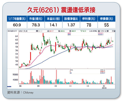 久元(6261)是IC暨LED檢測廠,近年積極布局新應用領域,除與牧德合資成立矽金光學,跨足半導體封測晶圓自動光學檢查系統市場(AOI)外,旗下轉投資久宏鑫擁有台灣第一座八吋石墨烯CVD爐,並成功產出第一片三十吋石墨烯膜,該石墨烯產品已開始送樣認證,應用領域包括電池電極材料、導熱及散熱材料、感測器及LED散熱、生物科技等。此外,與宏齊合作針對智慧機能衣及RFID射頻元件辨識開發自動化生產設備。久元去(二○一七)年十二月營收三.六二億元雙升(月增一二.五%、年增三九%)優於預期,顯示客戶投單動能強勁。久元指出,在產品應用布局方面,公司持續掌握自製設備研發技術和切入利基市場,尤其看好無線射頻標籤(RFID)對大數據蒐集之重要性,已研發自製RFID後段代工相關設備,跨足物聯網產業。受惠於電子標籤應用日益廣泛,久元與宏齊合資的子公司揚州久元,自二○一七下半年開始量產RFID電子標籤產品,由久元自製機台,宏齊負責生產電子標籤RFID晶片。目前揚州久元共有十四台設備,由於揚州久元生產的電子標籤具成本優勢,已獲得全球前三大成衣標籤廠青睞洽談下單,在國際大廠訂單挹注下,今年起將大幅貢獻營收。在RFID、晶圓級尺寸封裝(WLCSP)、Mini LED三大領域需求增溫下,將同步推動久元進入獲利成長軌道。【操作建議】股價於九月十一日拉回進入整理,時間已長達四個月,符合中期整理三至五個月的要求,近期成交量已逐漸放大,若能突破六五.七元則中多結構展開。