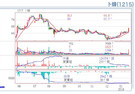 近來歐洲、中國、日本及韓國爆發嚴重禽流感疫情,加上台灣位於候鳥遷徙路徑,也難躲過這波疫情。一月十四日台北市動保處接獲台北市家禽批發市場通報,來自南投縣及台南市養禽場的紅羽土雞屠體,出現疑似禽流感症狀,經過檢驗已經確定為亞型禽流感病毒。近期受寒流侵襲,冬天進補需求大增,加上又將進入農曆春節旺季(今年農曆春節落在二月,肉品需求高峰期將落在去年十二月至今年第一季),需求將有增無減,但此時爆發禽流感疫情,恐讓市場供需缺口更為擴大,價格上漲將是必然的結果。目前每隻小雞價格漲至三十元、白肉雞每台斤價格上漲至三○.三元、紅羽土雞每台斤五十元、黑羽土雞每台斤五十五元、雞蛋每台斤二六.五元,皆創下波段新高。預期卜蜂(1215)及大成(1210)等相關業者有望搭上本波「漲價題材」的投資熱潮。卜蜂從飼料到雞豬等飼養和屠宰加工,多面向的投資帶來營收和毛利成長,至 二○一六年白肉雞電宰年產量約三一二五萬羽,市佔率一六%,白肉雞鋪貨至早餐業、餐飲業、超市、量販及便利商店等通路,二○一六年產量約一.六萬噸,市佔率約二○%。公司積極擴大畜產事業布局,雲林養鴨場已開始展開飼養計畫,今年首批種鴨可望養成。新設斗六飼料廠於去年第四季動工,預計今年底完工,種鴨及新飼料廠將在二○一九年開始貢獻營運。預料在公司資本支出持續投入下,自有飼養段的規模可持續擴張,除帶動獲利攀升外,也將降低飼料價格波動的影響。