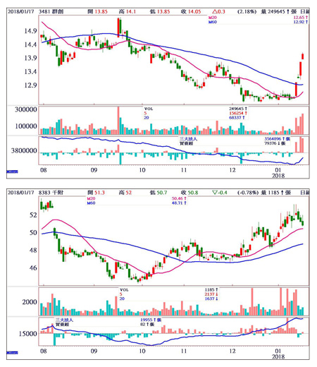 這一波在外資的引導下,加權指數很強,除了不斷的創波段新高之外,更攻上幾十年未見到的一一○○○點,當然,隨著指數來到這樣的位置,想作多卻又怕買到高點的投資人比比皆是,居高思危人之常情,但多方勢還是要作多,因此保持操作的原則,買低位階不追高位階方為獲利之道。中小尺寸面板淡季不淡目前低位階股或產業如面板,彩晶、群創、友達底部紛紛浮現,這三檔面板股,去(二○一七)年的獲利都非常亮眼,現階段股價又處於低位階,吸引一些想要賺取高殖利率的投資者進駐也很合理,但是就產業的成長性來看,還是要從選擇產業最具成長性的方向來著手。第一季為面板的傳統淡季,股價目前走的是補漲,而今年面板產業的成長重點,分成兩個區塊,一是中小尺寸面板這個部分,因為今年是十八比九無邊框全螢幕滲透率大幅提高的一年,接下來在三月份,開始會有愈來愈多的十八比九新應用機種推出,下半年甚至會有二十比九的新機種推出,因此中小尺寸面板有了淡季不淡的機會。所以現階段選股重點,在面板部分,還是以中小尺寸為優先,其中彩晶(6116)去年就已將部分產線調整為十八比九,這部分的成長可期,而群創(3481)則是先前接受了鴻海的路竹廠,也是屬於中小尺寸面板,應可隨著這次十八比九無邊框全螢幕滲透率大幅提高的一年而有所助益。