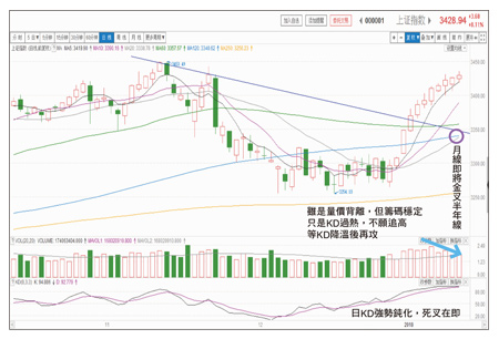 一月十二日上證指數漲三.六點,收在三四二八點,量縮價漲的十字陽線,創新高(三四三五點),雖然量價背離,但連續三個交易日守住五日均線支撐,且周K線是連二陽,量價溫和遞增,所以波段沒有疑慮。尤其是下方即將出現二十日均線金叉一二○日均線的中長期買訊,如果再繼續漲下去,則二十日均線還會往上金叉六十日均線,是中期買訊,所以就中長期來說,對多頭有利。短線上,用緩慢的爬行,慢慢收復去(二○一七)年十一月二十三日的大陰線,當天的最高點三四二九點,僅差一點就收復了,如果照這個趨勢發展下去,預期在收復三四五○前高點之前,恐怕都是蝸牛慢爬的走勢,重點還是擺在選股。短線量價背離 實是個股「惜售」由於一月十日當天出現過五十點的震幅,恐慌的氣氛一度籠罩盤面,令人記憶猶新,但是十日的下影線、十一日的續漲十連陽,又是那麼的有驚無險,所以當一月十二日再度同樣是下午盤一開就往下砸的過程,這次就顯得相對的謹慎,因為市場有了洗盤的經驗,所以最終十二日的成交量就沒有增加,顯示恐慌的情緒降溫,但追高的意願也不高,可是拋盤也謹慎。所以當下的短線量價背離,並非真的量價背離,而是只有個股才會出現的「惜售」,這是因為MSCI效應下的外資吸籌建立基本倉所造成的結果,在這個主基調的背景下,游資看準了農曆春節前的央行刻意維持資金相對寬鬆的政策偏多立場,於是積極拉抬次新股,形成人氣旺盛的多頭氣氛。