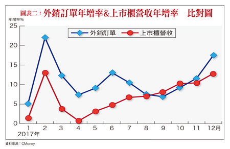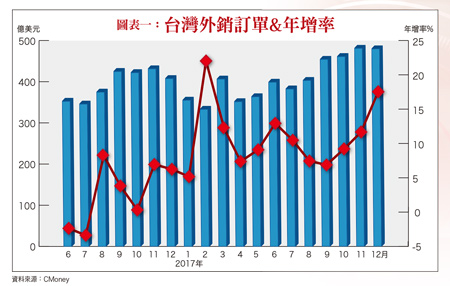台灣外銷接單亮麗 景氣熱度支撐信心經濟部統計處新公布的二○一七年十二月外銷訂單數據,金額為四八四.七億美元,年增一七.五%,連十七個月正成長;二○一七全年累計四九二八.一億美元,創歷年新高,年增一○.九%。由年增率來觀察,去年十~十二月的外銷接單年增率呈現加速揚升,資訊通信產品及電子產品表現仍舊亮眼,絲毫不受蘋果銷售不如預期的影響。顯然,其他行業的訂單彌補了消費性電子訂單不如預期的缺口,也代表景氣呈現全面復甦的景象,而不是局部行業。而十二月外銷訂單維持雙位數成長,再加上統計處預估今年一月接單金額約四五○~四六○億美元,因此,可合理預估上市櫃公司一至二月之整體營收水準將不會太差,這因素增強了市場持股信心,景氣基本面可望墊高台股下檔支撐。