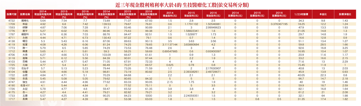 二○一七年主要係因新引擎零件製程(LEAP、PW系列)仍在開發以及轉量產初期,成本支出較大,且出貨狀況不如年初預估,加上匯率影響,使營運衰退。目前公司預計四月份新廠機台進駐完畢,約再經一個月認證便可正式投入營運,新廠將專注於車洗等機械加工件生產,預計機械加工件較易達經濟規模,有助於營運表現穩定,而本廠將著重於特殊製程零件開發與量產。預估二○一八年新引擎零件逐漸通過認證以及轉量產,毛利表現可望逐漸改善,公司預期二○一八年來自新引擎營收佔比可望超過一半,較二○一七年的一五%大幅提升,法人預估二○一八年毛利率可拉升至一九%以上,每股稅後獲利約○.九二元,呈現否極泰來之勢。近三年現金股利殖利率大於4的生技醫療化工股(依交易所分類)