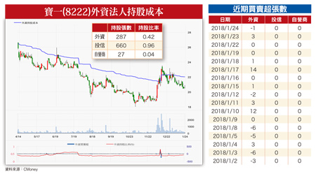 同時台耀也直接投資新藥公司,子公司台新藥本身進行ADC新藥開發,由台耀進行後段研發生產。台新藥去年八月併購日本新藥開發公司Activus,取得原料藥奈米化技術平台,以及兩個眼科產品,二○一八年將開始進行臨床,將申請505b2類新藥藥證,預計四至五年可上市,可望成為台耀未來新的長線增長動能。法人預估在沒有匯率干擾下,二○一八年每股獲利可達五.一四元,本益比有調升空間。新引擎零件出貨成長 寶一受惠否極泰來近一個月以來美股波音股價屢創新高,由於新機型的加速交貨,也將帶動相關供應鏈的出貨增加。根據GE資料顯示,LEAP引擎二○一八年預估交付一一五○至一千二百顆,二○一九年預估交付一八五○至一千九百顆,新舊引擎將進入交替高峰,訂單量可望持續成長。國內的飛機引擎零件供應廠寶一(8222),專注於發動機高溫段零組件(引擎燃燒段、渦輪段組件),擁有Nadcap以及多家航太廠相關認證,屬於航太引擎Tier 1供應商。