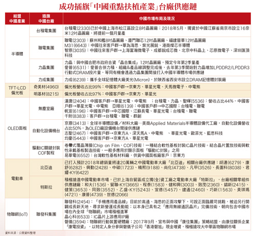 友達、群創面臨壓力 奇美材、明基材打入供應鏈中國官方多年前,亦曾以龐大資金銀彈、租稅優惠、投資獎勵等方式,力挺中國LED、太陽能等重點產業。中國廠商挾著官方強力奧援優勢,幾乎不用考量營運成本、設備折舊費用,強勢、大舉引發終端產品殺價大戰,台廠因無力招架中國對手強大搶市攻勢,多陷入營運低潮。法人認為,薄型面板產業,相較於太陽能、LED產業,動輒數以千億元新台幣規模計算之建廠成本,更屬於高額投資,更易受景氣循環波動影響。京東方獲中國官方強力、全面奧援下,全球第二條量產第六代柔性AMOLED產線,首條十.五代TFT-LCD產線,已於今年一月中旬左右成功交付首批面板成品等耀眼成就,已對台廠「面板雙虎」友達(2409)、群創(3481)造成強大壓力。繼太陽能、LED產業之後,面板業恐成為下一個打不過陸廠的落日產業。而相關供應鏈是否會以「打不過,就加入(紅色供應鏈)」營運策略因應,值得密切追蹤。奇美材(4960)、明基材(8215)二家原為TFT-LCD液晶面板重要零組件「偏光板」供應鏈,在實行「加入紅色供應鏈」政策下,目前已成功打入京東方、華星光電、深天馬、南京熊貓等中國面板廠零組件供應鏈。在龐大電子終端產品市場應用需求推升下,中國一躍而成全球半導體相關產品最大規模應用市場。以二○一六年為例,中國半導體應用市場規模占全球約四一%比重,全年進口總金額高達一.四九兆美元。不過,因中國半導體製造業整體產能不足以滿足國內龐大需求,因此每年半導體相關產品進口總金額遠超過中國可自給自主能量,進口總量始終居高不下,等同持續擴大中國半導體產業對外貿易逆差,中國政府因此痛定思痛,全力支援投資國內半導體製造業發展,希望最終可成功提高中國半導體產業市場自給自足比率。中國大陸為扶植半導體業成功壯大,大幅縮減積體電路相關產品進口量體,連年以「國家」級大基金、「地方政府」合資基金方式,挹注半導體產業強勁成長動能。同時,據台灣半導體設備大廠指出,中國政府為扶植其「紅色供應鏈」成長,可說是招數盡出。二年前,中國保監會公布「首台(套)重大技術裝備保險補償機制的試點工作」(簡稱「補貼保險」),只要中國企業願意採購中國本土製造之重大技術設備,即可由國家出資保費加以投保,倘若後續使用中國廠所產製機台設備,出現故障,因此造成營運損失時,中國企業可據以申請保險理賠,以協助推動重要設備機台由「中國製造」目標成功達標。過去二年來,產業扶持政策協助發展所獲具體成效相當明顯,知名中國半導體設備廠如:北方華創(中國高端半導體設備上市龍頭廠),甚至已成功打入台積電、三星設備供應鏈。兩相對比之下,反而台灣半導體設備產業國產化政策,推動多年下來,卻始終未見具體成效。中國半導體市場動能強 台積電、聯電、力晶積極卡位另一方面,中國半導體IC設計次產業,已有華為海思、紫光展銳等廠,成功擠進全球營收規模排名前十大IC設計廠金榜。IC封裝測試次產業中國廠中,亦已出現目前已成功搶下營收、市占率,全球排名第三大廠─江蘇長電科技(亦為中國IC封裝測試業龍頭廠)。中國政府持續透過大規模產業發展基金,推動半導體業成長的扶植策略,效益正持續顯現。TrendForce 預估,包含一期、二期大基金在內,加計各地方政府投入資本總額,未來將逼近達一兆元人民幣規模。大基金目前於半導體晶圓製造投資項目,企業與專案有:中芯國際、華力微電子、華虹宏力、士蘭微、長江存儲、耐威科技等,同時亦有部分重點發展專案仍積極進行中。根據TrendForce最新市調統計資料指出,自二○一六年至二○一七年底,中國新建、規劃中八吋、十二吋晶圓廠,共計已達二十八座。其中,十二吋晶圓廠有二十座,八吋廠有八座,大多數投產時間預定落於今(二○一八)年。預估至二○一八年底,中國十二吋晶圓廠晶圓製造月產能,將可達七十萬片左右,與二○一七年相較下,年增率高達四二.二%。同時,二○一八年總產值預估將可達人民幣一七六七億元,年成長率達二七.一二%。對台灣包含:台積電(2330)、聯電(2303)、力晶、力成(6239)等半導體廠商而言,一方面固然因為中國半導體廠羽翼漸豐,競爭力大幅提高,一方面也因中國半導體產值規模仍持續擴大中,因此,相繼前進中國、打入「紅色」出海口市場,可說已成為現階段「延續台灣半導體業生命週期競爭戰略」的市場顯學。台灣本土已經展開於中國興建,或是已上線量產多座八吋、十二吋晶圓廠產能者,抑或是即將以十六奈米先進、高階製程量產IC晶片廠商,莫不挪移較以往更大比例發展資源「加入中國半導體市場」,以免落後於全球重要性日益升高的中國半導體市場爭覇戰局。中國電動車發展政策定錨 台灣電池原材料、汽零廠搶紅包除了半導體、OLED面板等,中國目前正傾國力挺,且已小有所成的科技產業外,電動車、物聯網等,也因為全球日益升高的環保潔淨標準達標壓力加重,產值規模將於二○二○年,成長高達一.五兆元人民幣的物聯網市場,因此成為中國官方同樣視為必須大力相挺重點產業。