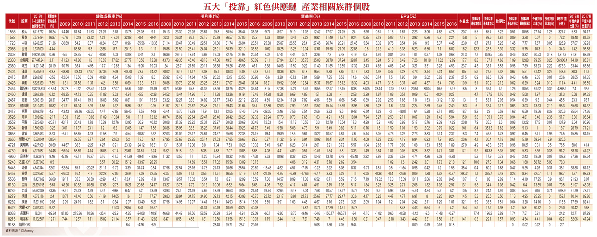 中國近年來整體汽車銷售量,已強勢超越美國、躍居全球最大規模市場,每年新增多達二八○○萬輛燃油車上路,約占全球年度總銷量三分之一占比,所產生廢氣、全球暖化效果自然相當驚人。因此,中國工信部副部長辛國斌於「二○一七中國汽車產業發展國際論壇」上已公開表示,「一些國家已明訂停止生產傳統能源汽車的時間表,工信部也已啟動相關研究,正會同其他部門制定禁止化石燃料汽車生產及販售的時限」,此項宣示,也就等同暗示中國將加快後續電動車發展腳步,中國整體電動車市場產值成長力道,勢必也將同步跟上奔向高轉速限區腳步。如此一來,除了目前已成功打入中國最大電動車廠「比亞迪(BYD)」零組件供應鏈台廠,如:胡連(6279)、康舒(6282)、興勤(2428)、中碳(1723)、精熙(9188)、尚化(4738)、凡甲(3526)、長園科(8038)、君耀-KY(6422)等,未來有機會跟進比亞迪電動車銷量成長腳步,零組件出貨量跟著搭上上升氣流以外,現階段正積極開發、進軍中國電動車市場的全球電動車知名大廠特斯拉(Tesla),隨著特斯拉持續擴大布點插旗中國已達五十萬輛以上年銷量電動車市場下,預料後市隨著相關零組件拉貨數量的持續成長下,將有利台廠「特斯拉供應鏈」廠如:和大(1536)、貿聯-KY(3665)、程泰(1583)、健和興(3003)、致茂(2360)、錩新(2415)、健策(3653)、同致(3552)、乙盛-KY(5243)、宣德(5457)、建通(2460)、巧新(1563)、美琪瑪(4721)、康普(4739)、世德(2066)等,未來營收業績成長動能、營運表現,同樣體現出「打不過,就加入的最佳營運策略。中國物聯網五兆人民幣商機 聯發科挾集團優勢積極搶進聯發科(2454)原本所擅長,市場咸認戰鬥力最強的「手機應用產品線」市場,目前於全球行動晶片龍頭廠高通(Qualcomm)、海思(Hisilicon)正面攻擊下,加以既有客戶(小米、OPPO、VIVO)已於去年十一月九日與高通簽訂供貨備忘錄(因為要利用「高通」的專利保護傘協助它們,於中國目前已進入成熟期、飽和,自二○一七年起將衰退三年的本土智慧型手機市場,成功進軍海外市場,延續企業成長動能),等同已被客戶給甩開,不再採用聯發科處理器及通訊晶片的最近市況競爭背景下,可說是已全面潰敗,聯發科必須及早開闢新天地,尋求新營運成長動能。目前看來,「物聯網」似已成為聯發科挾其以往累積多廣度、向「無線通訊晶片」研發技術及優勢,全面進擊的下一個藍海市場。工業電腦廠磐儀(3594)與聯發科合資設立的子公司磐旭智能,宣布與大中華區策略夥伴「康佳集團-中國電子電器製造集團」合作,攜手合擊搶攻中國龐大物聯網市場商機。磐旭智能指出,所推出之產業物聯網應用解決方案,可依據不同產業別客戶建置需求,加入各式應用元件,順利建構出完整硬體解決方案,因此可滿足客戶智能設備多樣化客製需求。預計此次與中國康佳集團深化合作關係下,將可為磐旭智能帶進達十億元以上人民幣市場商機。二○一三年底,磐旭智能由磐儀、聯發科共同合資成立,磐儀目前持股五七%,近三年營收維持倍數成長動能,二○一六年營收二.九八億元,年增率高達九七.三六%,總獲利○.四五億元,與前一年度虧損○.○七億元相比,成功轉虧為盈,首度交出獲利佳績。磐旭智能表示,現階段正持續耕耘不同行業應用市場,提供倉儲、物流、巡檢、家居、醫療、車聯網等物聯網相關應用領域完整解決方案。