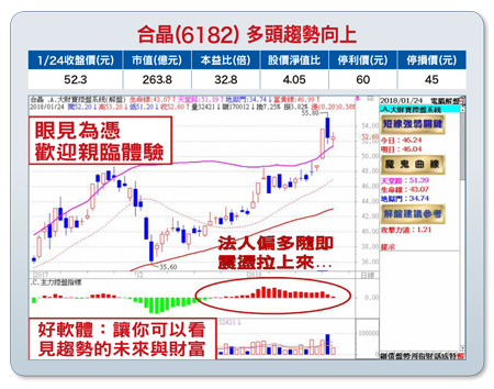 【個股推薦】合晶(6182)為全球前十大半導體矽晶圓材料供應商之一。主要利基題材有:(1)需求強勁,產能提升,營運持續看俏:受惠半導體矽晶圓強勁需求,產能利用率維持滿載,二○一七年十二月營收再度繳出五.八九億元好成績,月增八.三一%,年增四三.九八%,第四季集團合併營收達十六.七九億元,年增三四.二八%,季增一.七八%。因應市場強勁需求,合晶積極擴產因應,鄭州新廠上半年可望完工加入量產,配合楊梅廠、龍潭廠、上海合晶及上海晶盟的去瓶頸化增加產能,以滿足客戶訂單需求,後市營運持續看俏。(2)矽晶圓供不應求,全球矽晶圓市場喊燒:受惠物聯網及車用電子帶動半導體市場成長,全球矽晶圓矽晶圓需求極度熱絡,隨著矽晶圓缺口不斷擴大,晶圓代工與IDM廠爭搶產能,中國大陸半導體業者也加入搶奪貨源,第一季供給缺口達到一成。隨著半導體及IC產業景氣持續熱絡,矽晶圓報價持續看升。(3)昆山限排風暴,掀起半導體業大風暴:昆山為台商大本營,矽晶圓是半導體業最關鍵原材料,中國晶圓廠產能持續開出,台積電等一線業者持續擴產,對矽晶圓需求量大增,全球矽晶圓供應一路吃緊、價格大漲。綜上所述,配合籌碼面及技術面仍處於相對有利條件,以及券資比不斷攀升,一波軋空大漲行情蠢蠢欲動(※基本面資料若有異動,依公開資訊觀測站最新訊息為主)。【操作建議】低接不追高,下檔只要守穩四十五元關卡不破,逢低於富貴線附近仍可留意,隨著富貴線及生命線持續震盪走揚向上,配合控盤指標翻紅,一旦攻擊力道可持續維持強勢攻堅格局,後市仍將有大漲再創新高機會可期,設好停損停利(詳見附圖說明)。