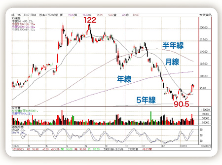 鴻海(2317)全球3C產品代工龍頭,富比士及財富全球五百大企業,每年出口值是大中華地區最大。集團全方位研發創新包括:奈米技術、環保製程、平面顯示器技術、無線通訊、精密模具、伺服器技術、光電、光通訊、網路,近年來也跨足AI、電動車、生技等新興產業。鴻海更是蘋果的重要夥伴,蘋果的訂單佔營收比重很大,去年iPhone X更將鴻海營收推上新的高峰,十二月營收六七五一億,年增五○%,創歷史單月新高,第四季營收一兆七三○二億,季增六○%、年增二三%,也是單季歷史新高,全年營收四兆七○七四億,年增八%,也是公司成立以來的新紀錄。反觀股價卻在歷史的相對低檔區,實屬不合理。鴻海二○○七年雷曼事件發生前股價高點三百元,當時加權指數九八五九點,現在指數已創二十八年新高一一二七○點,鴻海十年來股價走勢都沒有跟上國際的大多頭行情,實在很可惜。蘋果股價近期剛創歷史新高一八○美元,反而蘋概股近半年普遍跌三○%至五○%,和蘋果背道而馳。鴻海也由一二二元跌到九○.五元,跌幅二五%,近期守穩五年線並完成二個月底部,有機會形成一波新多頭。鴻海董監及大股東持股二四.○二%,三大法人持股四九.四四%,籌碼相對集中。目前股價站上月線九三.二元,下一步將向上挑戰年線一○二.五元及半年線一○六.五元。