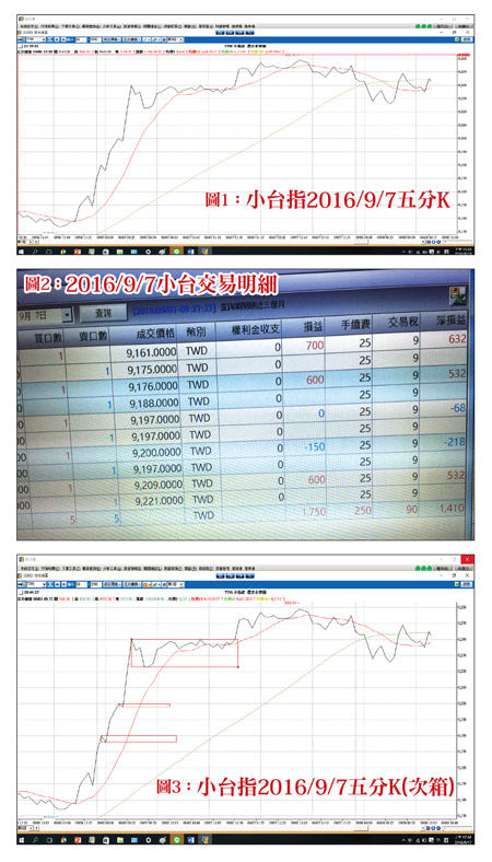現在的操作有了箱波均做依歸,心裡踏實許多,方向若不如預期會立刻砍倉,再不會有再看看、再等等的心態。之前做當沖主要用五分鐘線做進出,可是當速度盤來時,往往一直線上去一直線下去,找不到缺口可以進出,因此開始試著看一分鐘K線圖一起搭配,比較容易找到更理想的進出場點,但缺點是彎折太多又找不太到真正關鍵的次箱,盤中若不時的切換畫面也很不方便,進而影響到心情,因此我把畫面切割為二,一邊五分一邊一分K同時對照著看,關鍵的次箱還是以五分K為主。剛開始練習看一分K時,實在是非常的不習慣和緊張,尤其是看到K線快速的上下掃來掃去真的很嚇人,時常被掃出場,之後改成看收盤價線,情況才好一點,但也是花了好久的時間才克服心裡的恐懼。即使到現在有時候也還是抱不住,遇到拉回修正時會先出場觀望,待修正之後再次出現止跌缺口再進場。後來發現這樣的作法並不理想,因為再進場之後買進的價位變高不說,若沒留意遇到末段,則拉上去沒多久很快就殺下來,很危險的。所以還是要老實的按照老師教導的招式一切守紀律去操作,一段做完再做另一段,趨勢沒改變之前續抱,因為招式六:一波修正不阻斷,趨勢動力依舊在。例如二○一六年九月七日的例子(圖一),當天一開盤我從一分K切入九一六一買進,算是買在起漲點,但九點拉回修正時我就急著把它賣出,之後又同樣的模式操作了五次,最後一筆於九點三十分賣出九二二一(每次都是下一口小台),當天九點三十分之前收工結算共賺了三十五點(圖二)(扣除手續費及期交稅,下同),但是如果中間沒有隨意進出場,遵守紀律守好依照次箱操作法,九一六一買至九二二一賣,利潤應有六十點(圖三),這是一個極大的差異。盤後檢討發現五分K的次箱還沒重疊,不需要急著出場,甚至還可以抱到更高再賣出,因為次箱還未阻斷。因此,確實按照箱波均的訊號,觀察次箱的變化來操作,可以看出段落何時結束。當上漲段結束時,再操作另一相反的段落,如此即可獲得較好的利潤,更重要的是買進之後不會那麼容易就被掃出場,弄得自己也緊張兮兮。