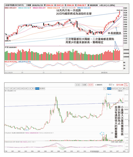 一月二十三日上證指數上漲四十五點,收在三五四六點,增量的實體陽線,收在次高,動用了一月份曾經領漲的石油、房地產與金融板塊,頗有各路多頭大軍匯集一路發動攻擊的態勢,三五○○點整數關卡成為二○一六年以來首個不需要停頓就過關的整數關卡,也在暗示著多頭在挑戰新高的過程,勢必要增量,而增量最好的辦法就是動用大型股,石油、房地產與金融就在這樣的需求下,藉著美元指數的弱勢,成為這波多頭控盤的工具。正因為這些大型股在動,所以指數必定是加速上漲,直到場外一直觀望的落後買盤積極進場時,才會休息。從周K線圖發現量價配合得當,無背離疑慮,也無異常大量,在連漲五周之後,預期農曆春節前仍有機會挑戰上升軌道的壓力,約三六五○點附近。銀行板塊是近期多頭領頭羊,也是人氣指標,價漲量增,一月十九日還留下多方缺口在三一五六至三二一七點,創近三年新高,毫無疑問,多頭既已投入大筆資金,自然不會這麼快抽離,特別銀行是目前市盈率與淨利率都不高的板塊,在美國財報月傳來摩根士丹利四季度投行、股票業務超預期的利多,創二○○八年金融海嘯後五五.八四美元新高價的激勵下,預期在A股創二年新高情況下,銀行與保險業應該有不少以前套牢,然後放在備供出售項目下,第四季度回沖利益應該頗豐,短線雖漲多隨時有拉回震盪的可能,可等待量縮價穩的下次買進機會。