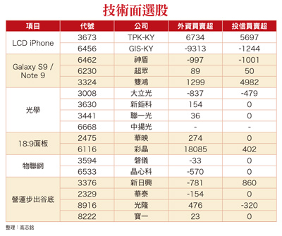 只要多頭不死 低基期好股就有機會未來只要資金持續轉進股市、股票類ETF規模持續增加,全球股市的多頭趨勢就會延續。在此之前,投資人只要管控好資金配置,就仍可偏多操作。考量上半年各產業基本面表現平平,外銷為主的公司又有去年財報認列匯損的潛在風險,選股上最好還是以股價低基期的類股並搭配題材亮點為主, 例如新一代iPhone、三星Galaxy S9 / Note 9、光學、十八比九螢幕、物聯網及營運步出谷底等族群。在iPhone X銷售不如預期,非蘋能否趁此搶回一些客戶,上半年將是很好的機會點。三星年度旗艦機Galaxy S9預計將於二月二十五日發表,三月十六日開賣,相較於Galaxy S8二○一七年四月下旬才開始首賣,Galaxy S9拉貨時間點可望提早,供應鏈熱導管的超眾(6230)及雙鴻(3324)一月起營收有機會優於去年同期。雙鴻今年智慧型手機熱導管產品除了持續供應三星外,還有華為的訂單。廣達的白牌伺服器訂單出貨,將於第二季起逐步成長,比亞迪(比亞迪宋車款)的電池散熱模組預計在第二季底可望交貨,上半年營運將有不錯成長動能。超眾今年NB產品線隨著高毛利產品應用增加,貢獻有望維持成長,英特爾新一代伺服器平台Purley的散熱模組也將於第二季陸續出貨,今年也將切入車載電腦散熱,增添營運新動能。