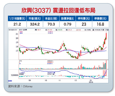 欣興(3037)是國內IC載板暨PCB大廠,也是全球最大手機板供應商,全球市佔率高達二成以上,產品營收比重:IC基板四五%、HDI板三五%、PCB一五%、軟板五%。欣興去(二○一七)年第四季營收創下歷史新高,主要是類載板(SLP)、軟硬結合板(RFPCB)出貨放量所致,尤其去年底因韓廠Interflex供應出包,導致蘋果iPhone X軟硬結合板急單轉給欣興,讓公司有望成為今年新款iPhone的主要軟硬結合板供應商。公司表示,今年類載板預計還會增加一、二家客戶,整體營運表現將會更好。欣興看好車用電子的長期發展,近年積極投資布局中國,去年下半年投產的湖北黃石廠,規畫分階段擴充車用、記憶體、消費性電子產品等應用,長期主攻汽車電子。此外,公司去年打入蘋果軟硬結合板供應鏈後,因產能具優勢,今年更可望成為主要供應商之一。今年下半年蘋果可能推出三款新手機:五.八吋及六.五吋OLED版與六.一吋LCD版,其中六.一吋LCD版iPhone出貨占比可望達到五○%,電池軟硬板單價比iPhone 8系列更高,供應鏈預估有欣興、燿華、華通等三家,而欣興市佔率達五成。由於欣興是六.一吋LCD版iPhone電池用軟硬結合板訂單的最主要供應商,在單價提高、數量提升雙重利基挹注下,今年將是公司成長爆發年,可逢低布局做中長期投資。