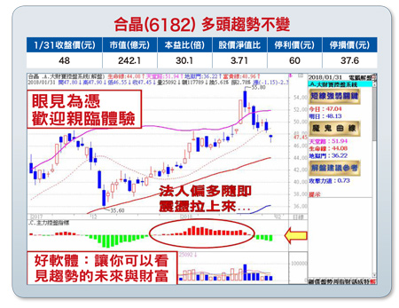 【個股推薦】合晶(6182)為全球前十大半導體矽晶圓材料供應商之一。主要利基題材有:(1)需求強勁,產能提升,營運持續看俏:受惠矽晶圓強勁需求,產能利用率維持滿載,二○一七年十二月營收再度繳出五.八九億元好成績,月增八.三一%,年增四三.九八8%,第四季集團合併營收達十六.七九億元,年增三四.二八%,季增一.七八%,。因應市場強勁需求,合晶積極擴產因應,鄭州新廠上半年可望完工加入量產,配合楊梅廠、龍潭廠、上海合晶及上海晶盟的去瓶頸化增加產能,以滿足客戶訂單需求,後市營運持續看俏。(2)矽晶圓供不應求,全球矽晶圓市場喊燒:受惠物聯網及車用電子帶動半導體市場成長,矽晶圓需求極度熱絡,供貨依然吃緊。隨著矽晶圓缺口不斷擴大,晶圓代工與IDM廠爭搶產能,中國大陸半導體業者也加入搶奪貨源,第一季矽晶圓報價提前大漲。隨著半導體及IC產業景氣持續熱絡,矽晶圓報價持續看升。(3)昆山限排風暴,掀起半導體業大風暴:昆山為台商大本營,矽晶圓是半導體業最關鍵原材料,加上中國晶圓廠產能持續開出,台積電等一線業者持續擴產,對矽晶圓需求大增,全球矽晶圓供應一路吃緊、價格大漲,一旦實施限排禁令,勢將再掀一波矽晶圓搶料大作戰。配合籌碼面及技術面仍處於相對有利條件,短線若有拉回,逢低仍可留意(※基本面資料若有異動,依公開資訊觀測站最新訊息為主)。【操作建議】低接不追高,下檔只要守穩三七.六元關卡不破,逢低於生命線附近仍可留意,在趨勢走多不變下,配合控盤指標若可翻紅上來,以及攻擊力道轉強,後市仍將有再創新高機會可期,設好停損停利(詳見附圖說明)。