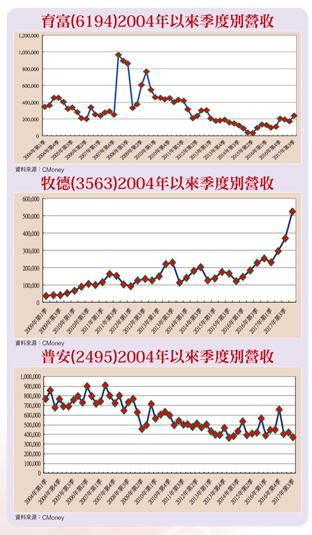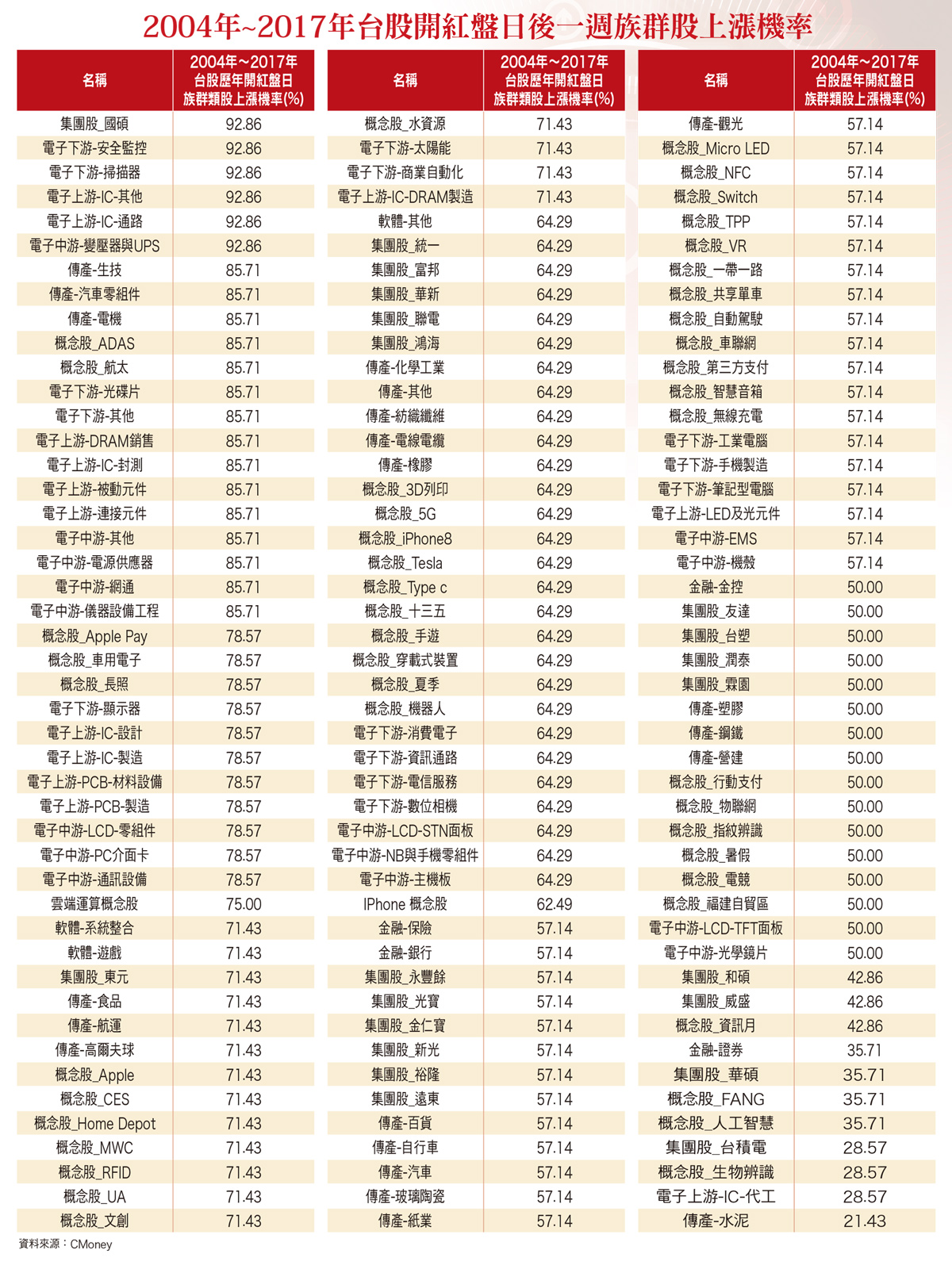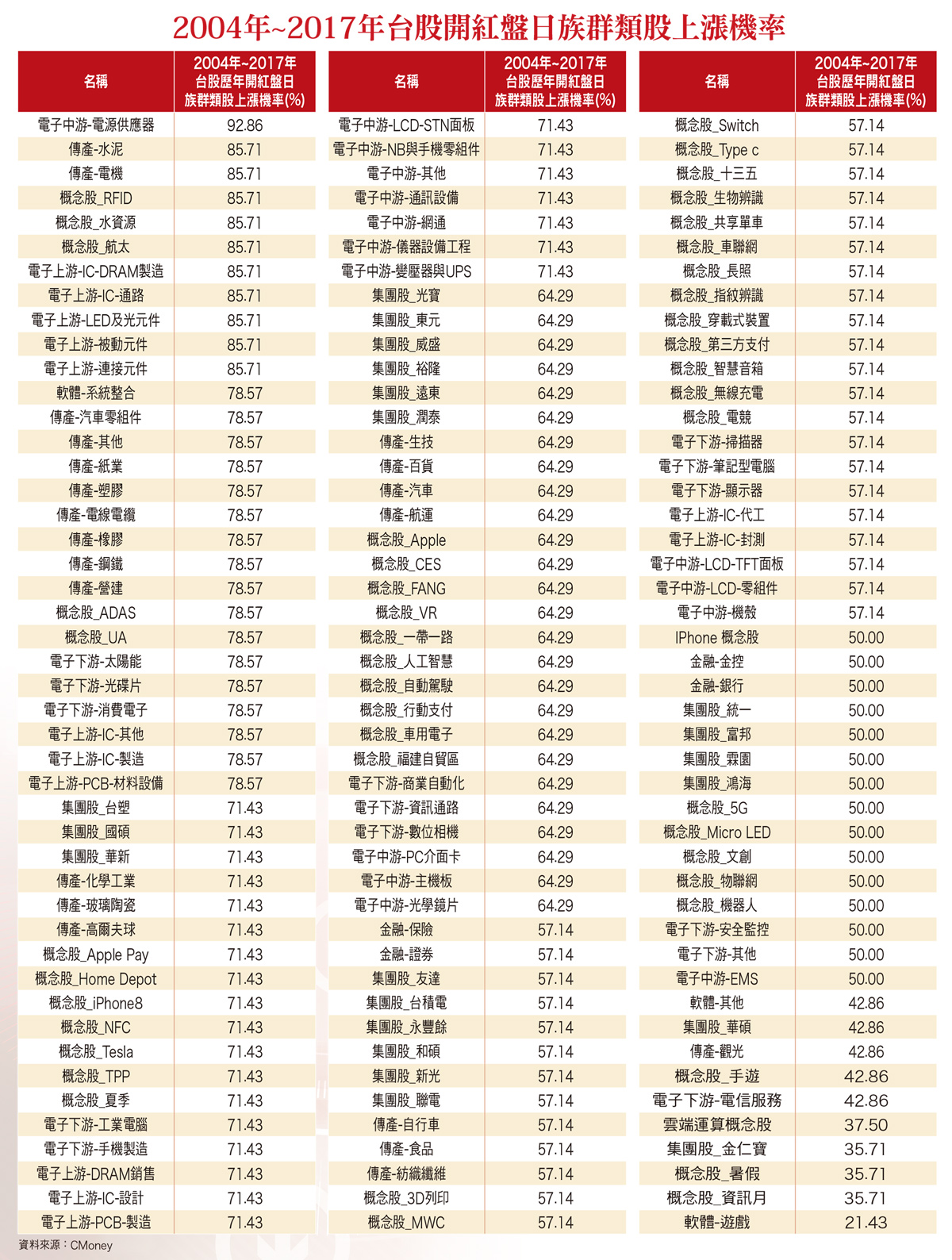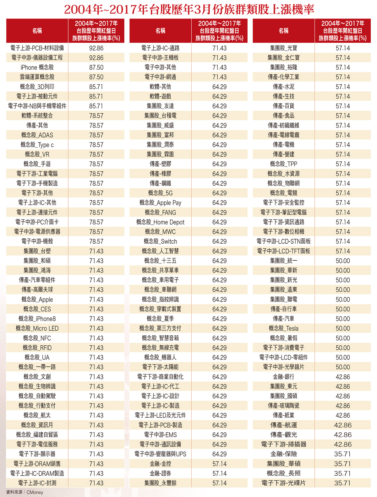 進一步就三月份股價上漲、收紅型態機率,達九○%(含)以上的印刷電路板、儀器設備工程,八○%(含)以上的雲端運算概念股等類股族群中,個別次產業龍頭股:育富(6194)、牧德(3563)、普安(2495)等,多可明顯看出,其第一季營收總額,皆為當年度四個季度別的相對低點(檔)。因此,可以說,台股過去十餘年來,盤面各產業、族群類股,三月份股價可順利上漲、漲升機率高達七○%(含)以上,成功收下月線紅K棒族群類股,絕大部份原因,其實應與基本面年度營收成長前景展望佳,透明度、單季營收逐漸走高等因素,呈現高度相關連動性。也就是說,這些於三月份股價順利上漲、收月線紅K棒族群類股,三月份的亮眼股價漲勢表現,可以定調、歸屬為「有基之彈」;也因此使其得以順利延續,先前十餘年來,農曆年開紅盤日之後一週,股價上漲機率皆達七五%以上漲勢慣性,於三月份繼續上演,亮眼股價漲升戲碼。2004年~2017年台股開紅盤日族群類股上漲機率2004年~2017年台股開紅盤日後一週族群上漲機率2004年~2017年台股歷年3月份族群類股上漲機率