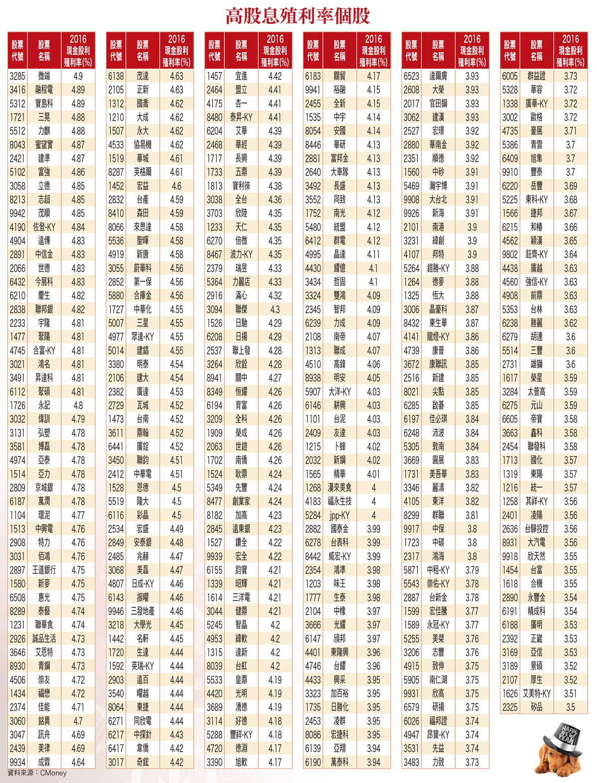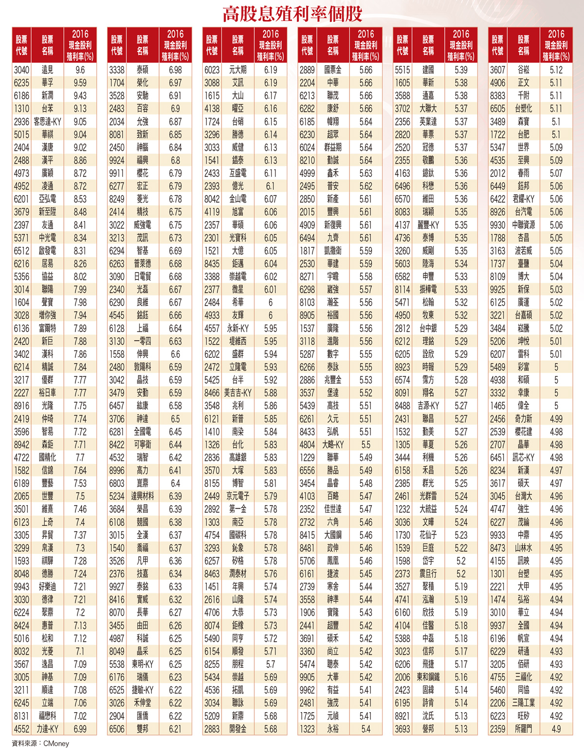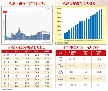 台塑四寶整體元月營收 年成長一七.一%力道強勁近期受惠油價攀高,原物料報價順勢走高,台塑化一月營收月增一四.九%;台塑一月營收年增率達二九.四%,南亞營收年增二一.五%,十分亮麗;台塑四寶整體元月營收一五一五.五二億元,年成長一七.一%,成長力道強勁。在全球景氣持續成長之下,基礎塑料產品需求可望持續提升,加上油價持穩,能支撐各類產品報價,營運有可期待的空間,加上後續有美國廠的擴產,長線上是兼具成長動能的配息指標股。高股息殖利率個股高股息殖利率個股