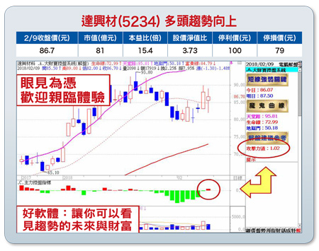 【個股推薦】達興材(5234)由友達旗下康利投資(持股二一.三二%)與長興化工(持股二九.五三%)合資,為國內首家特用化學材料Design House上市公司,國內最大面板相關化學品供應商。主要利基題材有:(1)新產品PSA配向膜助陣,營運攀峰:受惠大陸新建八.五代線以上大世代面板產線,對顯示器材料需求增加,以及新產品PSA配向膜PI、OLED有機介電絕緣層、OLED用高耐熱/高透明PI基板等放量出貨帶動,公司自結二○一七年第四季稅前盈餘達一.七五億元,每股稅前盈餘一.八元,全年每股稅前盈餘達五.七元,估EPS上看五元,創歷年新高,大大超越二○一六年三.七八元獲利水準。(2)下一個十年,顯示器、綠能、半導體將三路並進:董事長林正一表示,達興成立至今十二年,第一個十年在打下基礎,聚焦在顯示器材料、台灣市場;現在邁入第二個十年,除了深耕台灣之外,也會拓展海外市場,並佈局綠能、半導體材料市場。執行副總莊鋒域表示,公司營運有三大突破,一是PSA配向膜PI量產出貨,成為全球第三家有量產能力的公司,第二項是切入大陸新世代面板供應鏈,第三項則是切入半導體領域,開發出用在Wafer form有機離型層。展望今年,隨著大陸面板廠持續大幅擴充產能,全球市占率提升,產品外銷比重可望由第一季一四.五%攀升到第三季至一九.六%,京東方十.五代線接續量產,對於顯示器材料需求成長,整體接單能見度持續看俏,預估首季營收將可望保持在十億元大關之上,且預估全年獲利將有續挑戰六元再創新高機會可期。(※基本面資料若有異動,依公開資訊觀測站最新訊息為主)【操作建議】低接不追高,下檔守穩前低七十九元關卡不破,於富貴線附近仍可留意,配合控盤指標翻紅,一旦攻擊力道順勢轉強,仍將有強彈續漲再創新高機會可期,設好停損停利(詳見附圖說明)。