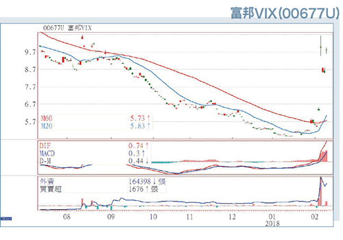 中碳(1723):受惠國際油價推升苯價上揚,使得澳洲等許多下游客戶時二月積極提貨。單月產量拉升至歷史新高的七千噸依舊供不應求,在苯量價均增之下,結算去年十二月份合併營業利益一.八二億元,合併稅前獲利二.○六億元,年成長達八成。而去年全年在軟瀝青報價走揚、石墨電極需求報價均有撐之下,去年合併稅前淨利十三.六五億元,每股稅前盈餘五.七六元。大江(8436):受惠中國對機能性飲料需求持續成長,加上近期電商平台微商城的需求,營收占比最高的飲料產品線需求暢旺,並帶動整體營運表現。市場看好,大江飲料廠稼動率提升至六成,在需求持續成長下,營收走揚。國泰美國道瓊反1(00669R):美債值利率上升逼近三%,引發股債平衡型ETF停損程式啟動,使得股市連鎖反應進入技術面修正,短線美股震盪將加劇,可利用反向ETF來進行避險。富邦VIX (00677U):美股持續修正,市場波動也不斷升高。衡量投資人恐慌情緒的VIX指數,近期也出現脈衝式的噴發走勢。在國際股市止穩之前,可在VIX指數回檔時,逢低布局相關正向商品來進行避險。