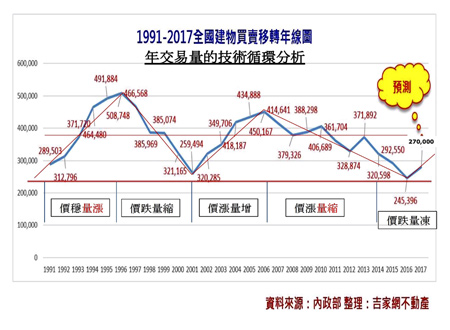 房地產市場的價量關係,如同股票市場,比較常見現象是「價漲量增」與「價跌量縮」,但偶爾也會出現「價漲量縮」與「價跌量增」的價量背離現象,針對健全房市而言,政府應塑造「價穩量增」的環境,只要經濟成長基本面向上,平均所得提升,民眾就會縮短換屋時程,對交易量就有很大助益。然而若在此基礎環境下,房市推動政策不當,就會造成市場炒作而暴起暴落;但若政策推動得宜,就會形成房地產「價穩量增」的良好市場環境。茲就一九九一至二○一七年間,房地產市場的價量發展趨勢現象分析如下:房市價量關係現象一「價穩量增」(1991~1997年):一九九○年之前十年,台灣歷經經濟起飛,GDP大幅成長,人均年所得跨越三千美元,大幅躍進到九千美元,游資充裕,房市股市大好,股市飆漲至一二六八二歷史高點,台北房價高漲四.五倍,一九八九年政策干預,結束八年半的台灣房市第三循環。一九九一年開始,台灣進入資訊代工輝煌十年,房市在谷底之上盤整近六年,但經濟成長率平均在六%上下,人均所得持續遞增,人民生活富裕,且三代同堂轉型,首購需求殷切,換屋需求更強,以致在一九九二至一九九七年間,房市處於「價穩量增」的最佳狀態。房市價量關係現象二「價跌量縮」(1997~2000年):一九九六年房市年交易量創下歷史新高到達五十萬八七四八戶,此時房價雖平穩且逐步加溫,市場一片看好,建商也大肆獵地,但一九九七年亞太金融風暴,引發金融危機,台灣雖倖免於難,但房市就進入「價跌量縮」格局,建商在一九九八至二○○○年間倒閉連連。房市價量關係現象三「價漲量增」(2001~2007年):房地產價格漲跌取決於市場供需,而需求面又分為實質需求與假性需求(短、中、長線投資),當資金氾濫、利率偏低時,資金不是流往股市就是往房市投資,房地產價格就會被一波又一波的接手者推高,短期獲利者越多,投資信心越足,交易量就水漲船高。二○○一年房市低檔,又逢政黨輪替,陳水扁總統擔心銀行逾放比過高引發金融風暴,下令增值稅減半,結果救了房市也救了銀行。二○○三至二○○七年的主升波段房價倍增,交易量也水漲船高,可以說是「價漲量增」的實證。房市價量關係現象四「價漲量縮」(2008~2014年):市場也有「價漲量縮」的「價量背離」的反現象,例如二○○八年全球金融海嘯,房市短期兩季跌幅一二%,此時剛好政黨第二次輪替,經濟成長率落到負成長,馬英九下令遺贈稅率由五○%大幅降至一○%,引發國外資金大回流風潮,房價因此再啟動一波末升段行情,但交易量動能卻推升有限,加上二○一一年實施奢侈稅,使得短線投資者二年內凍結存貨交易,市場交易量急縮,但因遺產稅降低造成資金大量回流,也因為奢侈稅二年內重稅產生市場閉鎖效應,抑制了市場交易量,卻無法壓制市場信心與價格,所以產生價漲量縮的反技術曲線,這就是因外力而造成的市場「價量背離」現象。