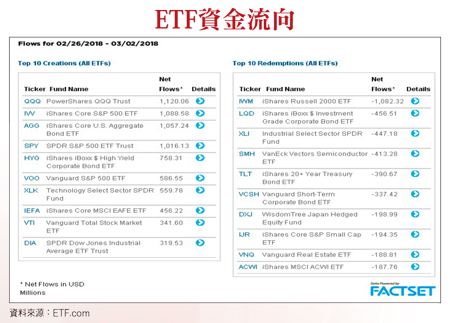 受美國聯準會(FED)今年升息次數可能增加的影響,市場敏感神經也跟著被挑動,進而引發近期金融市場的大地震。但在此同時,ETF市場資金仍持續由債轉股,顯示追逐高報酬的偏好尚未改變,研判在聯準會升息次數增加的預期衝擊逐步消化後,美股仍有再戰高點的機會!聯準會新任主席鮑威爾,二月二十七日首次出席國會聽證會釋出偏鷹派言論,導致市場對聯準會今年升息次數的預期,「由三次提高至四次」,恐將增加風險性資產價格的修正風險。另鮑威爾又表示部分「資產價格過高」,不僅讓市場情緒明顯轉為保守(根據每周公佈的AAII投資者情緒調查,也衝擊美股連四日的重挫,同時也增加資金回流美國的誘因,帶動美元指數逼近九十一的近期新高。無畏升息腳步加快 資金風險偏好未變不過,從資金面觀察,卻可發現即便市場情緒持續轉趨觀望,二月二十六日~三月二日當周ETF市場資金卻仍積極湧向美股ETF(在鮑威爾釋出偏鷹派言論後,ETF資金在二月二十八日~三月一日也仍維持由債轉股的趨勢),尤其買超第一名更是追蹤那斯達克指數的ETF,顯示ETF投資人追逐高報酬的偏好尚未改變(股票風險高於債券)。正因資金狂潮熱度不減,剛好成為美股下檔的重要支撐力量,終於在連續修正四日後見到反彈,又以科技股為主的那斯達克及費城半導體指數的彈升力道最強,甚至有領先創高的機會。由此更可確定,市場資金風險偏好程度仍相當高(科技股本益比高於金融股、傳產股),完全不受聯準會升息可能加快、美國公債殖利率飆高影響。若那斯達克及費城半導體指數能夠領先創高,與費城半導體指數走勢呈現高度正相關,且電子股占整體市值比重高的台股,自然就有跟漲的機會。