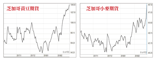 今年以來,國際間通膨的聲音一直不斷出現,就如同美國聯準會(FED)新任主席鮑威爾所暗示的~經濟好轉與對通膨的升溫,較為鷹派的言論讓美股表現出現修正,但也勾勒出接下來的投資重點之一,在於抗通膨,就如同近期台灣的衛生紙即將漲價的聲音,就如同經濟部暗示四月可能要漲電價,因此接下來抗通膨概念股將是重點選項。抗通膨概念股 低價庫存利差擴大抗通膨概念之一就是民生必需品,以衛生紙的漲價為例,「19」開頭的紙類股,消息一出股價就向上攻擊,但殊不知還有其他也要漲價的族群,其中就像食品股,國際商品價格中,如兩張附圖。由圖可見得,國際商品期貨中,黃豆與小麥自今年一月以來啟動了為幅不小的漲勢,黃豆期貨自九四三美元漲到一○四八美元,漲了一一%,小麥期貨自四一三美元漲到四八七美元,漲了一八%,漲幅相當驚人。而台廠中如卜蜂(1215)、大成(1210)、聯華(1229)等大宗物資都將受惠,先前農曆過年,二月營收表現可期之外,更重要的一點在於低價庫存的利差擴大,為因應過年,這些大廠往往會提前先備貨與備料,多備的料又遇上這一波漲價,接下來就會有較大的利差產生,在此利基點下,值得期待接下來的股價表現。中國惠台政策 看風向選股另外近期發酵的題材中,主要在中國惠台三十一項政策,當然因為台灣又即將要選舉,放蘿蔔出來很正常,但在此要探討的不是政治上的議題,而是在於這樣的政策中,有什麼個股能夠從中讓投資人得利。舉例來說,在文創股中,因為華研(8446)最近股價自一一○元漲到一三○元,受惠於中國惠台政策,台灣人參與中國電視節目、電影等,將不再受數量限制,以及放寬兩岸合拍電影電視的人員與投資比例等限制,同為電視電影製作的公司有VHQ-KY(4803)以及昇華(4806)。除此之外,我們從最近中國一些大廠的動向來看,也可以看出一個端倪,中國政策有更朝向扶植國內產業的動作,當然這一直是他們的策略,從一開始的吸收外資,到引入技術,現在陸續開始能夠收割,以華為新推出的兩款新機來看,所採用的都是國內海思的晶片,對台積電(2330)或是京元電(2449)來說,海思是台積電前十大客戶,又在京元電作下單測試,自然有利可圖。