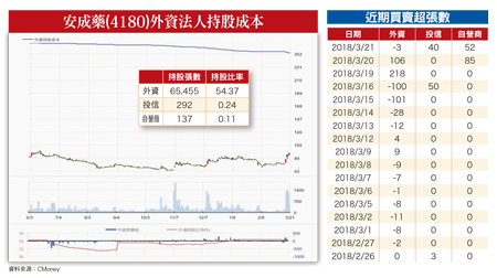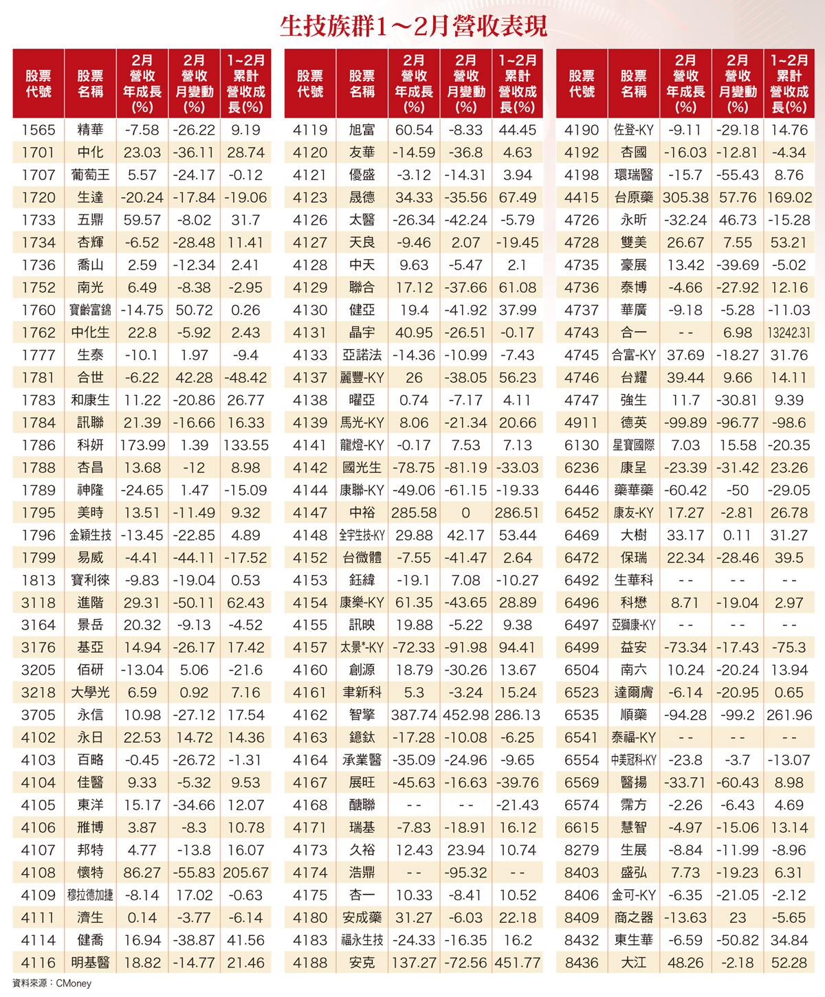 整理已久新藥廠 重獲資金關注近期新藥族群交易熱度逐步升溫,在大盤呈現膠著整理時,部分資金回頭重新關注時間及空間經過大幅修正的新藥股,形成整理盤的新亮點。觀察族群裡新藥研發進度已進入三期臨床,尤其二○一八年有機會取得藥證的公司,更是吸引市場高風險偏好的買盤青睞,值得後續追蹤。例如安成藥(4180),雖然不屬於新藥研發公司,但公司專攻高門檻學名藥也頗有斬獲,其二○一七年已有nifedipine、donepezil、megestrol、guanfacine 與hydroquinone等五款自有品牌藥品在美銷售。至於憂鬱症用藥Wel lbut r in® XL學名藥已在去年十一月獲證,公司預計將於今年三月出貨,預估二○一八年營收貢獻約三.七億元(約當市占率二%)。正申請藥證之TWi -017、Cardizem®學名藥由FDA給予之TAD各為二○一八年第一季、第二季,FDA近期無要求補件,可推測獲證機率大,法人預估二○一八年新增營收貢獻約一億元與一.七億元,基本上今年不缺題材,就看市場的認同度了。生技族群1∼2月營收表現