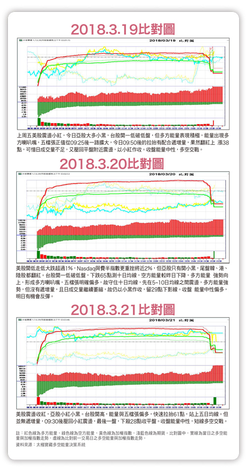 上周本欄已說明:三月十三日多方回補二月五日空方缺口之後,短線很容易先拉回測支撐,進行區間震盪,加權指數下檔支撐在一○八八二至一○九三七點,多方趨勢不變,逢拉回支撐區都是找買點。上周三(三月十四日)果然拉回五十六點,上周四(三月十五日)再跌二十點,上周五(三月十六日)國際股市小漲小跌,台股卻開一低破低盤,下殺七十五點,低點來到一○九三三點,剛好進入大支撐區上緣。多方能量下半場緩慢增強,五檔張正值也持續擴大,尾盤期現貨急拉,加權指數二十分鐘竟然強拉一一六點。收盤能量為短線買訊,成交量也大幅擴增,表示仍有再向上的機會。上周五美股震盪小紅,本周一(三月十九日)亞股大多小黑,台股開一低破低盤,但多方能量表現積極,能量出現多方喇叭嘴,五檔張正值從九點二十五分後一路擴大,九點五十分後的拉抬有配合遞增量,果然翻紅上漲三十八點,可惜日成交量不足,又壓回平盤附近震盪,以小紅作收。收盤能量轉為中性,多空交戰、區間震盪。三月二十日美股開低走低大跌超過一%,Nasdaq與費半指數更重挫將近二%,但亞股只有開小黑,尾盤韓、港、陸股都翻紅。台股開一低破低盤,下跌六十五點測十日均線,空方能量較前一天下降,多方能量強勢向上,形成多方喇叭嘴,五檔張明確偏多,故守住十日均線,先在五至十日均線之間震盪,多方能量強勢,但沒有遞增量,且日成交量繼續萎縮,故仍以小黑作收,留二十九點下影線。收盤能量中性偏多,極短線有機會反彈。三月二十一日果然出現反彈。美股震盪收紅,亞股小紅小黑。台股開高,能量與五檔張偏多,快速拉抬六十一點,站上五日均線。但並無遞增量,九點三十分後壓回小紅震盪。當天為三月台指結算,最後一盤特定力量用一五二○○張台塑化,硬壓十.五元,造成加權指數下殺二十八點收平盤。