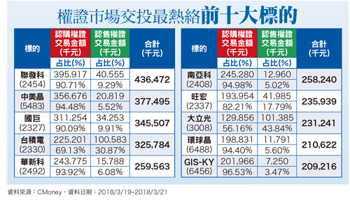 上周五(三月十六日受到富時指數季度調整的影響,外資轉為小買超十六.九億元,外資買超的標的,主要集中在金融股,買超的前二十名個股當中,金融股即佔了十二檔。但在台指期的淨多單部位,則大幅減少近七千口至四.一萬口,顯示外資心態有轉趨保守的現象。外資雖然上周整體轉為買超,但是並沒有出現賣超趨勢結束的訊號,顯示二月二日以來的賣超趨勢,仍在持續當中。由於國際貿易戰的疑慮有升溫的現象,加上美國科技股短線也進入漲多整理格局,並且本周還有FOMC會議,預期市場將觀望FOMC會後聲明。因此,仍維持外資本波賣超趨勢將持續至三月下旬的看法。本周權證排行榜,我們來看看近期股價大漲,引發諸多投資朋友注意的聯發科(2454),股價在三月二十一日盤中創下今年新高三四八元。聯發科於美國總統川普在博通(Broadcom)與高通(Qualcomm)的合併案扣上國家安全的大帽子之後,成為得利者,又加上本身第一顆AI新晶片P60一推出就在世界通訊大會(MWC)奪下最佳晶片獎,同時獲得多款智慧型手機確定使用,預計將在第二季進入拉貨旺季,在Andriod陣營中持續收復失去的市佔率,同時加入兩大智慧音箱,蘋果HomePod與亞馬遜的EchoDot供應鏈。
