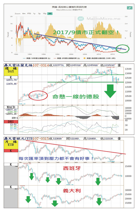 全球金融市場現在是多頭嗎?這應該是很多投資人想知道的問題,如果從台北股市來看,台股現在是多頭,但若是以為台股多頭所以金融市場是多頭,那就大錯特錯!站在較為宏觀的角度來看,金融市場主要分為商品原物料、債權與股權市場,先講現在趨勢最明確的債券市場,現在的債券市場在利率持續上揚且未來將會持續的環境下,確定債市已經步入長期的空頭市場。資金真的變少了!至於股市則是進入輪跌的架構中,假設全球股市走多頭,則各國股市將是輪動輪漲,在過去QE資金外溢效應的帶動之下,幾乎所有的股市都是向上走揚,然而從FED宣布升息、縮表開始,資金開始逐漸減少,而資金減少的效應就從今年二月的金融市場修正展開,先從歐元區開始,之後跟著是美股,然後是新興市場、日、韓等股市都進行輪跌修正走勢,而歐元區中經濟實力最強的德股領先重挫之後,在反彈上相對全球股市無力,可見得市場機制這隻黑手在資金有限的情況下,已經無法推升歐元區反彈。歐債風暴將再起!就現在資金緊縮程度來看,僅能推升美股中的科技類股走揚,S&P500、道瓊指數走勢都相對弱勢,到近幾天德股在美股回檔的帶動之下,又開始面臨破低點的危機,已可說是命懸一線的情況,這條線就是一萬二千點這條大頸線,一旦德股跌破,則回到二○一六年十二月起攻點一○五○○點就是可以預見的未來。對照歐元匯率近期的強勢,時間一長,難免會再度讓歐債危機升溫,保不定現在的歐股走跌已經在反映歐債風暴的未來,或甚至是更加嚴重的危機。最強NASDAQ也跳水惹!三月十九日晚上的美股在FED利率決策會議結果出爐前,在臉書傳出資安危機重挫超過六%的帶動之下,最強勢的那斯達克指數出現了向下跳空缺口,按技術分析理論來看,若在接下來的二至三個交易日內沒能在指數收盤時站回到空方缺口之上,那麼科技股將面臨波段修正的風險。而道瓊指數也在該交易日突破收斂三角形型態向下表態走弱,接下來只要沒有攻過三月十四日高點位置,則美股仍然是在走盤跌的架構。所以其實從股市的架構來看,除了歐美股市輪跌之外,美股科技、傳產等內部結構也開始出現輪動輪跌的架構!至於在全球最弱勢的市場─中國股市的表現上,也難免受到國際市場的環境所影響,未來中國股市掛牌結構將有明顯改變,趁著仍在底部時調整股市結構,未來才能有機會追上美國,筆者對於中國市場長線投資價值仍然非常看好。