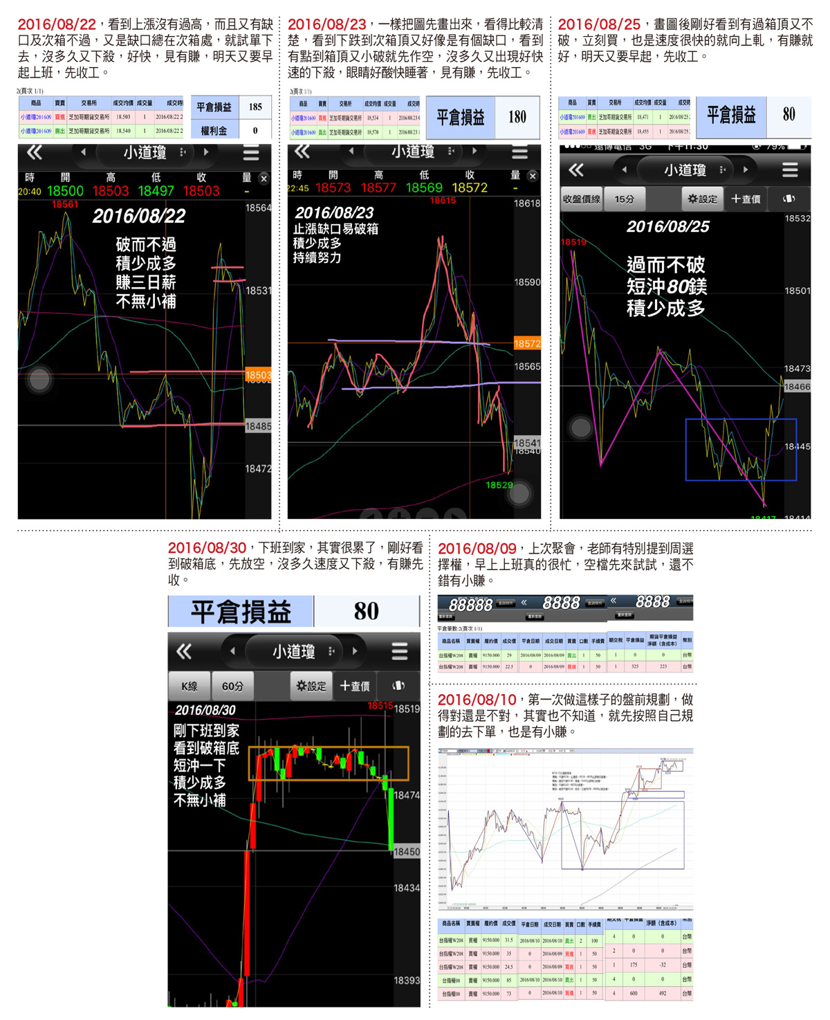 本人以過來人的心情寫下這段平實的紀錄,一般散戶所經歷過的歷程我也一一經歷過了,約莫十年前從朋友開始介紹投資股票可以賺錢,開始步入了萬劫不復的深淵,初嘗獲利的滋味,內心就開始胡思亂想,哇!如果以這樣賺錢的速度其實根本不用工作嘛?聽明牌、市場小道消息、購買書籍及上課程,其實很多過程是自己在騙自己,明明虧損但內心總存在希望。更有趣的是還相信玄妙之說,弄風水花錢消災補運,更甚玩到走火入魔,經由朋友介紹還參加地下期貨的操作,輸到本金不多的情況下,還跟當時的戰友串通一人重押一邊,獲利的收錢,虧錢的跑路,金額再兩人平分,搞到組頭找上門來弄得不可開交,自己輸的不說,被騙的也不少。現在回想起來真是歷歷在目,更覺得可笑,當初的自己怎會如此無知如此可笑,財迷心竅。現在回過頭來看,真的就只是想著賺錢但卻找錯方法,或許人運勢不好時,再加上自己沒有靜心檢討,是很容易被自己的心魔牽著走的。但這一路走來我似乎沒有放棄過,因為我覺得可以一天輸這麼多,相對的也可以一天賺這麼多,就像一句廣告所言,期股操作源自於虧錢的熱愛。我雖然不曾放棄,也一直在找答案跟方法,但投資績效始終載浮載沉,並沒有一個穩定的獲利方式。或許是老天的眷顧抑或是緣分,在偶然的機會裡遇到了呂老師的箱波均理論,剛開始時只是覺得奇怪,為何老師說的一些關鍵總是一次一次的出現,但看PO文卻又看不太懂,大概知道是怎麼一回事,但卻又理不清頭緒,直到自己慢慢深入投入自己的投資之路,才漸漸有起色並轉虧為盈,以往對於行情總沒有一個定見,漲時說漲跌時說跌,追高殺低,實在是盡了散戶所有應盡的義務。一路從股票輸到期貨跟選擇權無不傷痕累累。跟各位讀者分享一下,如果連股票都操作不好,千萬別想操作期貨跟選擇權,別因獲利快槓桿高而投入,其實真相是槓桿高虧損更大更快,字面上在看都很容易,光一個停損一般人就很難做到了,何況真實面臨盤面數字瞬間跳動的情況下,你會更容易失去判斷。數年前的我也看了不少這樣的忠告,但只有親臨實境才能感受真實震撼教育一般的情境,這是N年前寫下的一段話:「做多會被殺,做空又被尬,乾脆兩邊做,當沖兩頭八,到底怎樣做,實在搞不懂,收盤看損益,帳戶剩零頭。」這即是對於行情及技術分析沒有一套方法的結果。平倉損益