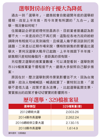 今(二○一八)年三二九房市,北台灣推案量預估可超過二千億元,部分建商為了避開年底九合一選舉的干擾,都傾向在上半年推案。此外,根據房仲業調查,民眾看淡房市的比例大大縮減,買盤力道在增溫,而全台雖仍以低總價的中小坪房型為主,但北台灣已見中大坪數的換屋族群出籠,顯見市場已脫離前兩年的低谷。房市看跌比例正在收斂信義房屋不動產企研室專案經理曾敬德表示,民眾對於房價的感受與預期,會影響民眾是否決定在當下購屋,從二○一五至二○一六年幾次的購屋意向調查發現,有五季的調查結果,看跌房價比例都超過七成,當時也就是房市信心最低迷與恐慌的時間,市場交易量也萎縮到近年新低量。此次調查看跌房價的比例收斂至五○%,是近三年調查以來最低的一次,雖然看漲房價的比例仍不到一成,房市距離樂觀仍有一段差距,但二○一七年第四季看跌和持平的差距是五二%,一路收斂到現在看跌比持平的僅多八%,越來越多的受訪者由悲觀的看跌,已轉為中性持平。此外,全國不動產針對網友進行二○一八年下半年購屋意願調查,發現看跌未來房價走勢比例僅二九.七%,且看好房價上漲的人更近半數,顯示民眾對於房價不悲觀。全國不動產總經理石吉平指出,有逾六成的民眾從去年第一季開始看屋,所以購屋族對於房價的感受、對於房市的看法也直接反映在交易量上,去年全台交易量就達二六.六萬棟,年增約八%,顯示民眾對於房市態度改變,比較積極進場購屋。