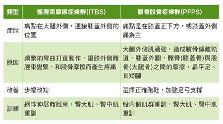 前幾天跑半馬,二十一公里跑完之後,膝蓋的位置好痠好痛,是不是我沒有熱身?雖然以前有舊傷,但兩條腿膝蓋都痛,小腿也好像快抽筋了。」很多上班族都像他一樣,假日跟團去運動,但是平日周一到周五沒有跑步或騎車的習慣,也沒有重量訓練臀部、腿部等肌群,往往每次跑每次痛,痛完再休息一至二周,又繼續比賽,如果持續這樣的循環,很可能摧毀膝關節,直到有一天必須開刀做膝關節置換。小腿快抽筋,是由於長時間跑步,造成的肌肉收縮,導致僵硬和電解質流失而失衡,很多人跑步過程中,感受到緊繃,放任不管繼續跑下去,其實這時就應該到場邊,停下腳步來拉筋,伸展小腿腓腸肌直到疼痛舒緩,並且補充水、電解質減緩。跑步跨步短一點 騎單車雙腳勿外八或內八騎車或跑步後的膝蓋痛,可根據疼痛的位置,分為兩種:一、髂脛束摩擦症候群(ITBS),二、髕骨股骨症候群(PFPS)。髂脛束摩擦症候群痛點是在大腿外側,連接膝蓋外側的位置,因為頻繁的彎曲打直的動作,會讓膝外側的髂脛束變緊,跟大腿外側股骨摩擦久了,就會產生膝蓋外側痛。又或者是因為扁平足、X形腿、長短腳(短的那隻腳),因主力在腿前側、內側肌群,而使得大腿外側髂脛束被拉扯,產生疼痛。如果跑步時,步幅改短一點的跨步,會感覺好一點;騎單車則是要注意,畫圓過程中,雙腳膝蓋和腳尖一同朝著前進方向,而不是外八或內八。賽後或平常日,需要做髂脛束放鬆,可以利用網球,以雙手支撐的側躺姿,運用身體重量,壓在球上,撐開大腿外側的一整條痛點,並訓練較無力的臀部肌群,向後抬腿至腰部高度。或是雙腳外八,膝蓋也朝同方向的外八深蹲,才可以避免過度使用股四頭肌,卻因臀大肌、臀中肌比較弱,都沒使用到而受傷。