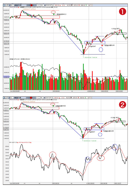 ★破除量價、RSI的迷思以前還沒學習箱波均常在電視財經節目聽到量能與價的關係,想一想有量無價、有價無量、新低量會有什麼價之類的話題,如圖一的時間二○一五年四月初至十月底日K加權,平均量能大約落在八六○○,在量能高於九五○○的幾次和低於八五○○的幾次,有出現量高價漲、量高價跌、量低價漲、量低價低,到底是要做多或做空呢?完全沒有依據。使用箱波均的方法很容易,只要把圖一紅色的關鍵箱找出來,分成箱底和箱頂,再來就是做等待的動作,等待什麼呢?等待箱頂底的過而不破或破而不過再動作,如圖一當紅色箱出現破箱底又不過箱底時作出買進空單的動作,後續出現下跌的情況,這時再對照量能有高有低,卻完全不知道方向。再來對照圖一藍色關鍵箱,分成箱底和箱頂,等待箱頂底的過而不破或破而不過再動作,如圖一藍色箱出現過箱頂又不破箱頂時作出買進多單的動作,後續出現上漲的情況。我們只是把關鍵箱找出來,用過而不破、破而不過來研判漲跌,而不用量能的高低來參考,所以用箱波均的方法是不是很容易呢?RSI來說(圖二),我們假設紅線之上是做多,紅線之下是做空,用上述箱波均方法操作時,紅色箱關鍵箱出現破而不過買進空單的位置來對照RSI,RSI是在紅線之上是做多,這時如果參考RSI去做多會如何?被殺多。藍色箱關鍵出現過而不破買進多單的位置來對照RSI,RSI是在紅線之下是做空,這時如果參考RSI去做空會如何?被軋空。箱波均的操作方法是不是破解RSI的迷思,避開被殺多軋空的危機呢?