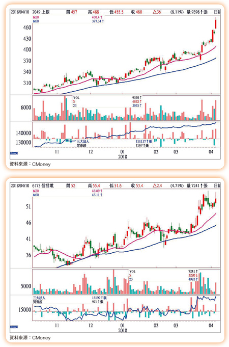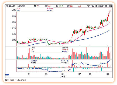 本週理周投研部精選產業基本面前景展望佳,營收成長動能強,外資、投信搶收籌碼,拉高市場籌碼穩定度,股價有機會走出波段漲勢鏢股:直得(1597)、上銀(2049)、信昌電(6173)等。直得三月營收年增八成 直得(1597):公告三月營收一.九五億元,月增達四○.六八%,年增率更高達八○.四三%;一至三月累計營收五.○五億元,年增率同樣高達九七.一五%。直得核心產品「微型線性滑軌」約占整體營收比重六○%,「標準型線性滑軌」三○%,新產品「線性馬達模組」近五%。標準型產品主要以自動化設備、工具機等加工機應用零組件為主;利基型產品「微型線性滑軌」,平均毛利率達四五%;「線性馬達模組」毛利率逾五○%,因目前出貨規模較小,對整體營收、獲利貢獻幅度不大。直得去年台灣內銷占整體營收約二○%,外銷八○%;中國市場占直得去年全年營收三○%以上,歐洲市場約占一四%至一五%比重,美國市場約一○%。去年營收成長表現最為突出地區為中國市場,年增高達九○%;台灣、歐洲市場去年營收成長率皆達四○%左右,美國市場去年營收年增率約二八%。受惠去年日本傳動系統大廠轉單效應,營收成長率大幅跳增達五一.四七%,營收、獲利雙雙創下歷史新高。另一方面,南科舊廠已於第一季進行更新,購入三台新機台上線,以解決製程前端技術問題,下半年開始產能可望達滿載水位。樹谷廠二期提前二月動工,資本支出達八億元,預計最快年底正式投產,可貢獻總產值達十五億元。法人機構推估,樹谷新廠一、二期上線投產後,大型線性滑軌占直得整體營收比重可望順勢拉高。法人機構預估直得今年營收可達一八.四六億元左右,年增約二四.○四%,EPS約四.九九元。上銀產能滿載 營運逐季走揚上銀(2049):公告三月營收二三.八五億元,月增二四.七五%,年增達四八.八四%;一至三月累計營收六五.五二億元,年增率高達五二.三七%。上銀滾珠螺桿位居全球龍頭,線性滑軌亦為全球第二大。智慧自動化應用需求帶動,加以全球半導體業開始進入擴產高峰期,關鍵零組件廠接單持續火熱。上銀中國蘇州廠目前規劃以後段加工為主,未來將逐步向前段延伸,年度銷售目標預估可上看二十億人民幣。除既有線性滑軌、滾珠螺桿等產品組裝外,也規劃布建多軸機器人組裝產線,瞄準中國「製造二○二五」商機。預估設備業市場景氣展望仍佳,加以半導體擴廠需求挹注,零組件供應持續吃緊,上銀及多數同業在手訂單現階段皆已達六至九個月。法人預估上銀上半年營收仍有望逐季走揚維持年增榮景。上銀第一季營收大幅擴增,主要受惠「智慧自動化」市場需求持續升溫,接單暢旺。中國市場需求強勁,新建廠房已陸續完工投產,產能規模逐月擴增。上銀董事長表示,今年產能已達滿載,訂單能見度已可掌握至明年上半年。今年上半年營運將優於去年同期,甚至可較去年下半年為優,預料下半年將可維持逐季成長態勢。法人機構預估上銀今年營收可達二八五.七三億元左右,年增約二一.五五%,EPS約一五.一二元。信昌電(6173):公告三月營收三.五七億元,月增三○.九九%,年增達三一.二一%;一至三月累計營收九.四七億元,年增二八.九二%。