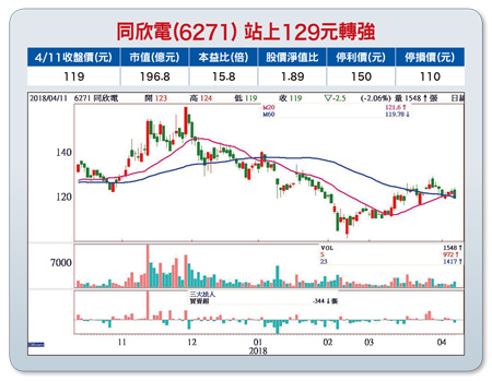 近期美股容易受到中美貿易戰消息面影響而急漲急跌,進而影響到台股短線的波動。但投資朋友有發現嗎,自美中貿易戰開打以來,最近三個星期台股就在一○七○○至一一○○○點間狹幅震盪。因此對中美貿易戰看法仍不變,只會影響短線,而不會改變美國和台灣今年景氣仍往上的中長多格局,一一二七○點預計第二季中末就有機會突破。短線區間整理短線而言,融券已剩二十五萬張上下,意謂軋空行情已經暫告一段落。三月營收公布完,至五月中就是要陸續反映第一季財報利多和利空。蘋概股和多數電子股仍處於傳統淡季,公布前容易壓抑股價,故短期台股應該仍是區間整理格局,加權指數強勢的話守半年線一○七五○點上下,弱勢則回測年線一○五○○點上下的看法仍不變。大多數蘋概股的操作原則,就是買在淡季利空近尾聲時,而獲利了結在拉貨旺季利多時。不過,因為上中下游供應鏈的關係,每一檔蘋概股的營運落底時間亦不相同,有些蘋概股股價還有低點,少數幾檔低點卻已經過了,準備領先悄悄震盪走高上去。 同欣電(6271)為高功率LED散熱陶瓷基板、利基型多晶模組封裝領導廠商,主要營收項目包括LED散熱陶瓷基板、高頻無線通訊模組封裝(PA模組封裝)、混合積體電路模組封裝(MEMS封裝)、影像感測器(CIS)封裝。二○一七年每股賺五.九一元,配息六元,殖利率約五%上下。