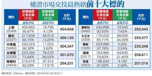 財政部公布三月出口為二九九.九億美元,創歷年單月新高,月增率三一.四%,年增率一六.七%。三月出口創新高主要受惠於新興科技應用帶動,積體電路出口再創新高,加上海外機械需求延續升勢,以及國際原油、基本金屬價格高檔盤堅。累計一至三月出口為七九七.四億元,年增率一○.六%,為連六季兩位數成長。三月進口值為二三九.九億美元,月增率二三.三%,年增率一○.四%。累計一至三月進口為六八一.四億元,年增率一一.三%。本周權證觀察到非揮發性記憶體大廠旺宏(2337),四月九日公布三月營收達三二.五二億元,月增率一九.七%,年增率三四.九%,營收明顯回溫。累計今年第一季合併營收九○.六一億元,年增率三七.一%。旺宏去(二○一七)年靠三大主力產品ROM、NOR Flash和SLC NAND Flash三箭齊發,全年稅後純益五五.一八億元,每股純益三.一二元。今年旺宏三大產品線同步成長,預估全年營收成長一○%至四七二.七三億元,年增三八.二%,在毛利率部分,預估為四三.八%,稅後淨利一一七.一億元,年增一一二.四%,EPS 六.五九元。旺宏目前股價淨值比約處於過去五年○.八至五倍中間位置。
