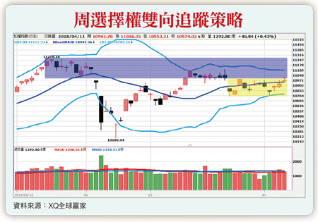 博鰲論壇在海南盛大展開,中國國家主席習近平在會中承諾將擴大開放中國市場,並調降汽車關稅與提升知識財產權的執法強度。這一連串的承諾,被市場放大解讀為對川普的善意回應,帶動美股四大指數反彈回到整理區上緣。連假期間國際市場被中美雙方的叫囂搞得焦頭爛額,台股在收假後卻開出紅盤,展現出強韌的走勢。從基本面來看,國發會統計二月份景氣燈號,從黃藍燈回到景氣穩定的綠燈,主計處統計的第一季出口規模,也在電子零組件強勁帶動下,創下歷年同期新高的七九七.四億美元,年增一○.六%。有如此強勁的基本面支撐,台股能撐過這段國際市場的大地震自然也就說得過去。接著從技術面分析,大盤走勢這段期間落在一○八○○~一○九五○點的區間狹幅整理,當型態開始進入收斂階段,便是多空雙方表態支時。再來是籌碼在台動向,外資在台指期未平倉部位,四月十一日仍維持在四萬八千口水平,近期開始出現較為明確的動作。自營商選擇權未平倉部位,Sell Call從連假前的幾百口加碼至一萬五千多口,Sell Put維持在七萬多口,相比連假之前,自營商再次變得較為保守。整體來看,法人立場呈現中性偏多布局,且外資有逐步加碼跡象,或許有意拉高下週四月合約的結算,但近期國際市場波動較大,導致選擇權權利金偏貴,為壓低成本,可利用溫漲(買權多頭價差)策略布局結算行情。