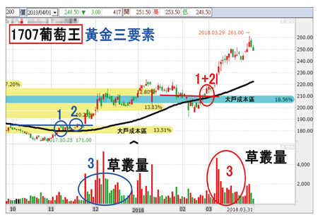 但LEO告訴各位,就算知道大戶成本在哪裡,大家也不一定能受得了股價躺平不動,處於盤整區時的煎熬,有時候動輒長達半年,甚至於一年以上。但如果各位可以等到股價站上大戶成本區時,才進場買進,這時候大戶已經處於獲利狀態,當然就很有機會因為技術面的轉強,吸引場外資金一同共襄盛舉開始往上快速攀升。第三,出現草叢量:這個名詞乍看之下有點摸不著頭緒,各位可以回想是不是常常遇到股價轉強第一根就跑去追,結果隔天馬上就回到起漲點被套牢,這就是LEO要表達的關鍵,當一檔股票要產生波段行情時,也就是續航力強的股票,絕對不會只有一日行情,要怎麼判斷呢?就是要出現一撮一撮的草叢量,而不是單根大量,這表示股價的上攻動能強勁,且經過充分換手。股價要漲就必須有柴火,這些柴火就是成交量,成交量要穩定量增,價量結構佳,股價才漲得久。舉一個三月初LEO搜尋到的例子,在去年十一月初葡萄王符合了:(1)價過多空方向線且方向線由下降走平轉上升,(2)價過大戶成本區,(3)出現換手草叢量,結果股價從一八五元很快漲到二二○元左右才遇到另一道大戶成本區,價差三十五元。再來是今年二月底時又再次符合黃金三要素,股價從二一一元一路漲到三月二十九日的最高價來到二六一元,價差五十元。所以透過簡單的黃金三要素,很容易就可以賺到波段利潤,下次我們再接著介紹五力全開的其他四個面向吧。