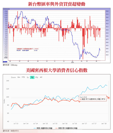 證券市場詭譎多變本是常態,價格的呈現是全市場參與者決定出來的,又因人心難測,時而貪婪時而恐懼,更讓短線走勢難以預測。十三日星期五,美股開高走低收盤下挫,周一台股強勢抗跌,平盤附近作收;周一晚間美股大漲,周二台股卻開平一路走低,截稿前重挫作收,一部分市場說法歸咎於隔日的中共軍演,但軍演是先前就已知的事,卻還影響股匯走勢,這就是人心難測之處。進入超級財報周 美股續彈機率大不過,股市短線雖難以預測,中長期的波動卻很難自外於基本面的框架,這是我們可以深入探究的方向。關於目前的外部環境,首先還是美股走勢最為重要,先前提過美股四月反彈機率大,近期美股震盪盤堅的走勢符合預期,預計波段反彈可持續至四月底。其中,企業獲利的大幅成長是主要原因,根據Factset的預估,S&P500企業第一季整體獲利年增率預估約一七.二%,且有一八七家成分股的財報將於四月二十三~二十七日陸續公布,是美股下檔支撐墊高的主要依靠,重點是第二季的整體獲利年增率預估更勝於第一季,約達一九.一%。眾所周知,企業獲利的增長動能是推升股價的最核心動力,也是市場估值提升的依據。市場隨時都有短期的經濟或非經濟因素的訊息干擾,投資人只要掌握基本面的趨勢,就不易迷失方向。如前所述,四月美股既然反彈機率大,則對台股走勢具加分效果,唯中期需留意的有核心消費CPI的變化,其攸關FED的升息速度,以及消費者信心指數,其反映消費者對美國經濟信心強弱的程度。以目前數據觀察消費市場動向,並非萬里無雲,日前剛公布的美國四月密西根大學消費者信心指數初值為九七.八,低於預期的一○○.五,因三月終值為十四年新高一○一.四,所以四月回落的差幅創二○一六年十月以來最深,幸好美國消費者信心還處在相對高位,必須持續追蹤,但若是連續兩個月都出現這樣的落差,投資人就得小心謹慎了。再把焦點拉回國內,新台幣走勢可能成為近期的重要變數,將影響外資對台股的積極度。