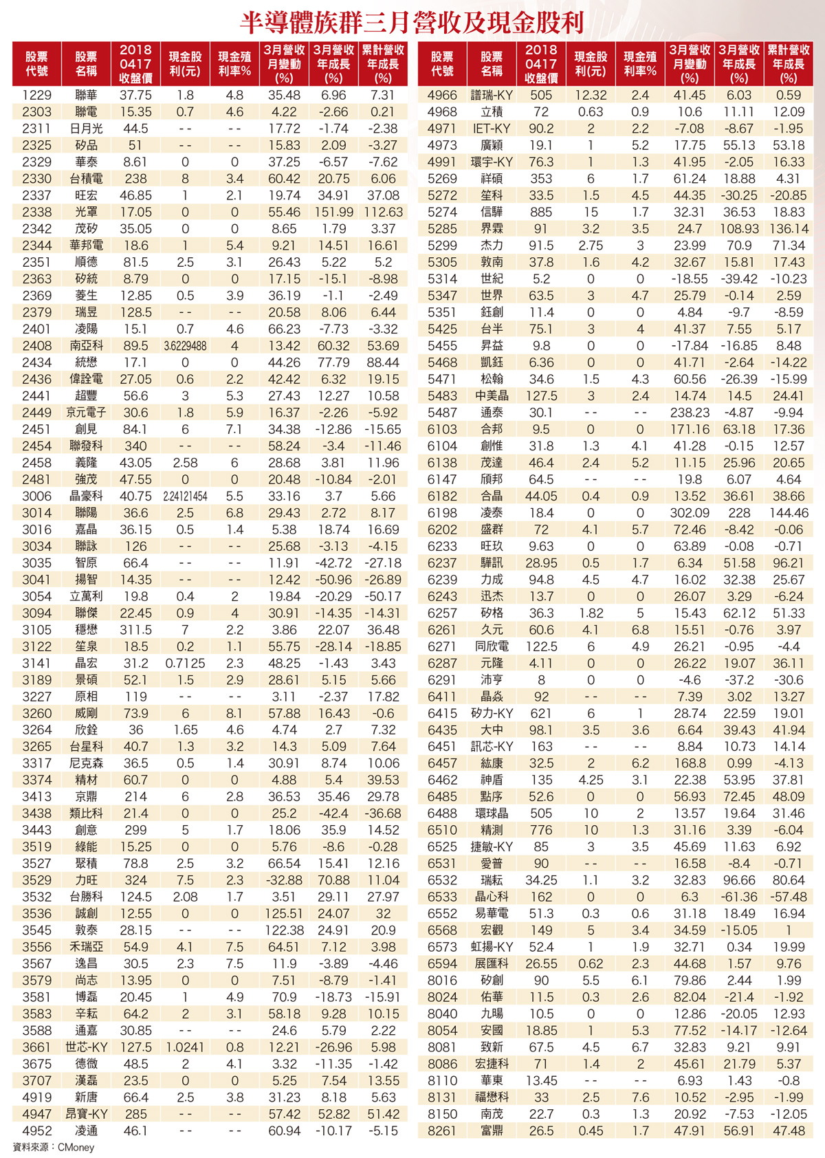 新台幣關鍵反轉影響 快速貶值勝過緩貶在國際上,弱勢美元格局迄今尚未扭轉,新台幣去年以來的這波強勢升值,時間超過一年,升幅也達一成以上,但近期慣性有改變的跡象,截稿前新台幣兌美元匯率已連續四個交易日走貶,達二九.四二五,創下近三個月新低。通常手握大筆銀彈的大型國際基金,十分重視投資區域的匯率升貶,所以,新台幣最好的走勢是快速貶值,一步到位,然後持穩。如果新台幣緩貶的慣性形成,容易造成預期心理,降低外資對台股的積極性,甚至引起在台外資持續性匯出,這對台股後勢發展將扣分。半導體不斷成長 趨勢向上 能見度高未來人類生活型態的發展,將重度依賴半導體產業,所有應用面的發展,都以「數據」為中心,將帶來新一波技術創新,諸如自動駕駛、人工智慧、5G、虛擬實境、沉浸式媒體等等。舉例而言,Intel 預估二○二○年平均每個網路用戶,每天約會產生一.五GB資料流量,自駕車每天會產生四.○TB資料,而智慧工廠每天產生的視訊資料量更高達五.○PB,但這些龐大資料都需要經過運算,才能變成對人類有用的數據。資料的處理過程與儲存,則全數仰賴半導體元件。Qualcomm則預估,在二○二○年以前,智慧型手機、IoT與安全、網路通訊、自動汽車、無線射頻與雲端等產業機會將超過一五○○億美元,這些市場全數建立在半導體產業的蓬勃發展基礎之上。市調機構IC Insights三月中旬也宣布調升今年全球半導體市場成長預測,由原估的八%,一口氣上修至十五%,調幅將近一倍。既然半導體快速成長的態勢不變,除了晶圓代工與記憶體的成長持續看好以外,舉凡半導體製程會使用到的所有相關元件或原物料,都是成長能見度高的相關次族群,例如先前提過的上游矽晶圓即是其一。電子級工業氣體 受惠半導體超級循環另外,半導體的耗材領域也是受惠族群之一,例如聯華(1229),雖然主要業務為生產各種品項的麵粉以及麵粉加工產品,但其主要獲利來源是與半導體息息相關的製程氣體材料,如子公司的工業氣體產品(聯華林德,持股五○%),聯華猶如控股公司,除了聯華林德以外,其他主要權益法轉投資業務有石化工業產品(聯成,持股三二%)、資通訊產品(神通電腦)等,各項轉投資認列之權益法收益佔聯華稅前淨利比重達七成,而當中又以聯華林德及聯成為主要獲利貢獻來源。聯華林德目前在臺灣整體氣體市場市佔率約五成,電子級特殊氣體市佔更達約六成水準,其中電子客戶多集中於半導體、光電產業,聯華林德在桃園及台中港區預計新增一個特殊氣體工廠,主要用於半導體高階製程使用,未來隨電子客戶持續投入資本支出、擴充產能,電子級特殊氣體使用量將維持成長慣性。中國市場是未來成長重心 聯華林德供氣市佔將再提升中國部分,目前聯華林德和林德在中國氣體市場分工合作,以產業別進行業務劃分,電子客戶的供氣由聯華林德承接,而非電子客戶則由林德氣體包辦。法人預估聯華林德目前在中國電子級特殊氣體市佔約一○%,中國區年營收規模目前約四十億元新台幣,隨著中國電子業高速發展,除配合台廠客戶擴產外,也受惠於林德氣體的全球客戶經營基礎。由於合作廠林德的電子客戶欲進入中國設廠,多會尋求聯華林德進行供氣,預期將有助於聯華林德進一步提升中國的市佔率。現階段中國半導體產業快速發展得益於政府的高度重視與大力扶持,將使積體電路產業鏈與行業生態體系快速成型,一系列鼓勵半導體產業發展的優惠政策相繼出爐後,中國旺盛的需求和持續擴大的供需缺口,吸引了台積電、Global founderies、聯電等大廠紛紛在大陸設立先進製程晶圓廠,方便就近服務中國大陸的客戶。大陸地區十二寸晶圓廠現有產能為五二.五萬片/月,約占全球十二寸晶圓廠產能的十二%。根據SEMI 預測,二○一七~二○二○年全球將有六十二座新的晶圓廠投入營運。這六十二座晶圓廠中,七座是研發用的晶圓廠,而其他晶圓廠均是量產型廠房,以地理區來看,中國大陸二○一七~二○二○年將有二六座新的晶圓廠投入營運,占新增晶圓廠的比重高達四二%。聯華林德配合客戶的擴廠規劃,目前在中國投入約一.一億歐元的資金進行擴產,為晶圓、記憶體和平板顯示器生產廠提供電子級特殊氣體。聯華林德今年豐收 聯華可望母以子貴根據聯華林德的合資方Linde (LIN GR)揭露之訊息,目前聯華林德已取得京東方(000725 SZ)福建新建面板廠的氣體供應合約,搭上中國面板建廠潮商機,且建廠進度優於預期,聯華林德將是中國半導體及光電廠擴產趨勢的大贏家,法人預估二○一八年工業氣體的獲利成長約一九.八%,聯華(1229)也將母以子貴,本益比未來將有上調空間。半導體族群三月營 收及現金股利