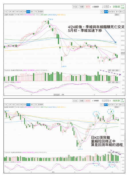 四月十三日上證指數跌二十一點,收三一五九點,量縮實體陰線,依舊受制於二十日均線壓力,如果未來一周還是被二十日均線壓制住的話,那麼等到四月二十四日前後季線跟年線進一步構成中期空頭的死亡交叉訊號,則多頭的處境將更加不利。上證六月前恐再測三千點關卡 創業板後市看俏目前短多的反彈力度無法封閉三月二十三日的三一八八至三二四二點空方缺口,導致三二五○點以上形成層層套牢,加上月KD預估還有三個月以上的拉回修正期,推測在六月加入MSCI之前,可能還會再測試三千點關卡,持倉不宜過多,留意風險。創業板短線因為日KD的頂背離,進入到技術面的拉回修正,但始終守在年線之上,等待季線五月中旬以前跟年線構成黃金交叉,所以未來兩周是考驗多頭強度的時候。由於近期機構密集發行了八檔創業板ETF,可知機構對於創業板的後勢頗為看好。自從二月九日跌破年線之後,至今仍然還是失守年線。由於年線一般會被認為是多頭的最後防線,自然造成當下的買盤縮手觀望,也因此處在相對高位的藍籌股,開始出現不耐久盤的籌碼鬆動跡象,例如復星醫藥與恒瑞醫藥都是高位出現大量長陰線收跌的訊號,不過更重要的是,這是單一案例還是藍籌股籌碼鬆動的開始,值得追蹤。就走勢來看,如果再跌有可能構成頭部型態的個股,如中國平安、萬科A、五糧液、伊利股份、金風科技、美的集團、貴州茅台、京東方A、格力電器、亨通光電等,由於都是績優股,更容易出現捨不得止損的問題,因此當下就必須想清楚,要依照基本面進行長期投資,還是參考技術面進行操作。