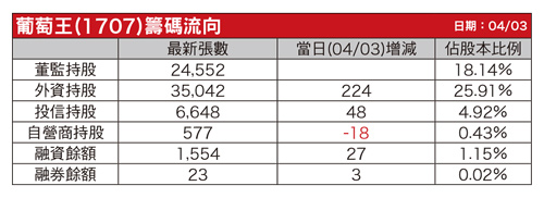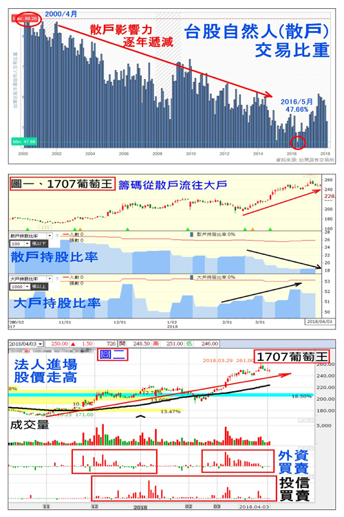 在上一期周刊介紹了選股標準SOP:五力全開─黃金三要素,並以葡萄王(1707)為例,告訴投資人選股第一個力,就是「技術力」,而技術力只是五力其中之一,技術力─黃金三要素:(1)價過多空方向線,(2)價過大戶成本區,(3)出現草叢量,這就是第一力:技術力。第二力就是「籌碼力」,每一家公司的股票都有一定的股本,原則上股本的規模大小是固定的,但如果有遇到增資或減資或分拆時,股本的大小就會變大或變小。為什麼要了解一家公司的股本大小呢?一般來說,股本小的公司因為股票總發行張數較少,若發生持股集中在少數人手上,則股價漲跌就跟這些少數人持股的變化息息相關,那我們該如何拆解籌碼呢? 拆解籌碼:董監、法人、融資券簡單來說,可先將公司籌碼區分為董監持股(內部人)、外資持股、投信持股、自營商持股、融資餘額、融券餘額。(1)董監持股:籌碼較為安定,持股不會常常發生變化,畢竟大股東或內部利害關係人要轉讓持股都必須要提前申報,所以變化較少,但董監事是對公司最了解的內部人,所以其持股變化要時時關心,如果董監持股幾乎都拿去質押借款,對公司來說也不是一件好事,尤其當股價跌到董監質押成本區時,更是要密切關注!也許公司就會在那個點強力護盤,實施庫藏股避免董監事被追繳保證金,但萬一護盤不力,可能經營權就要易主,嚴重可能公司都要發生危機呢!葡萄王董監持股約一八.一四%。(2)外資、投信、自營商我們稱之為三大法人,也是對公司股價具有關鍵影響力的法人機構,但是要觀察到底哪個法人持股比例最高,才能判斷是否具有關鍵影響力。而葡萄王外資持股二五.九一%、投信持股四.九二%、自營商○.四三%,顯然外資對葡萄王這檔股票而言具備關鍵影響力,因為外資持股比董監事合計一八.一四%更高,所以我們知道要觀察這檔股票的籌碼就必須優先關注外資的動態。(3)散戶也是股市中重要的一角,以往大家習慣把融資餘額,簡單說就是借錢買股票的總張數當成是散戶的動態,其實經過這麼多年台股漸趨成熟,散戶的交易佔比已逐年下降,從二○○○年四月占比八八.二六%,到二○一六年五月最低已經來到四七.六六%,到二○一八年二月來到五四.四二%,簡單說就是法人的參與率逐年攀升,散戶的影響力已經逐年下降。而融資買股的比率也越來越低,畢竟這麼多年來散戶被融資斷頭數次,對於融資使用反而更加小心,反倒是有時候我們看到某些主力色彩濃厚的股票在起漲點就資券同增,是另一種重要觀察訊號。以葡萄王來看融資餘額僅佔股本一.一五%,所以融資並不是我們觀察的重點。