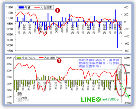 觀察近期走勢,最為關鍵為四月二十日這個交易,因台積電公布財測不佳,導致台股跳空開低走低,近期大盤就整個台股歷史來說仍是在相對高檔,如無非常強之利多很難創高,稍有閃失就容易呈現下殺走勢,上週五(四月二十日)到本期截稿日(四月二十四日)行情已經連三黑,向下走勢確立,因此就技術面來說不猜底,偏空操作為主。就溫拿魯蛇籌碼來看,如圖一,外資在期貨與現貨合計來看是呈現賣超,且幅度持續放大,近期外資操作上仍是賣超為主,近幾個交易日賣超多於買超。尤其是四月十九日外資一度大幅看好,但就在隔天受台積電財測不佳事件影響,當日更出現期現貨合計賣超高達六九○億元的超級大量,一時要扭轉也不容易。如圖二,魯蛇籌碼方面則是瞬間偏空轉偏多,更在外資出現超級賣超大量同時魯蛇積極買超,就籌碼面整體而言兩者皆呈現偏空。綜合以上,換成合適的選擇權的操作,就技術面與籌碼狀態來看,以偏空走勢為主,建議轉為逢高賣出買權策略為宜。