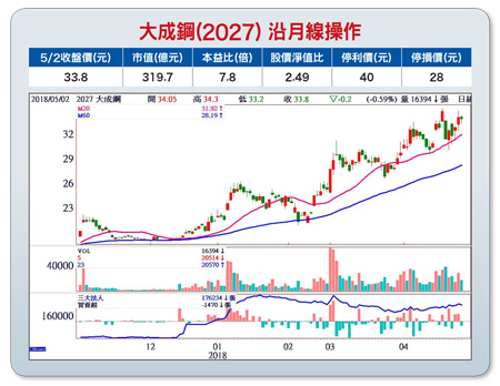 低價庫存挹注 大成鋼第二季看更佳大成鋼(2027)從去(二○一七)年第四季起即受惠於美國對中國進口的鋁板進行雙反調查,帶動鋁板出貨走熱,今年一、二月鋁出貨量已超越不鏽鋼,並帶動大成鋼業績增長力道強勁。第一季鋁價大漲,帶動成品價格調漲,大成鋼在低價庫存挹注下,第一季獲利預計比去年第四季將有明顯增長。今年一至三月營收為二一八.○五億元,較去年同期增加六三.八二%,法人預估第一季每股獲利就有機會挑戰去年全年EPS一.二八元。展望第二季,隨著鎳價成本高升,帶動不鏽鋼行情跟漲,大成鋼將直接受惠,並將持續受惠低價庫存利益,如果這一波不鏽鋼價格漲勢確立,大成鋼第二季獲利有機會更佳,法人估今年全年EPS上看五元左右。